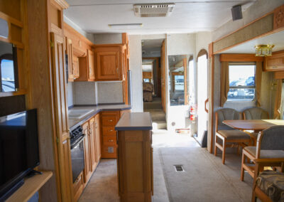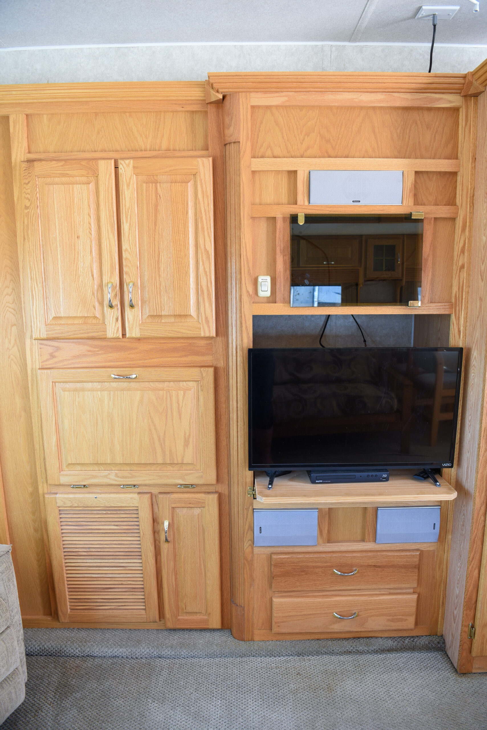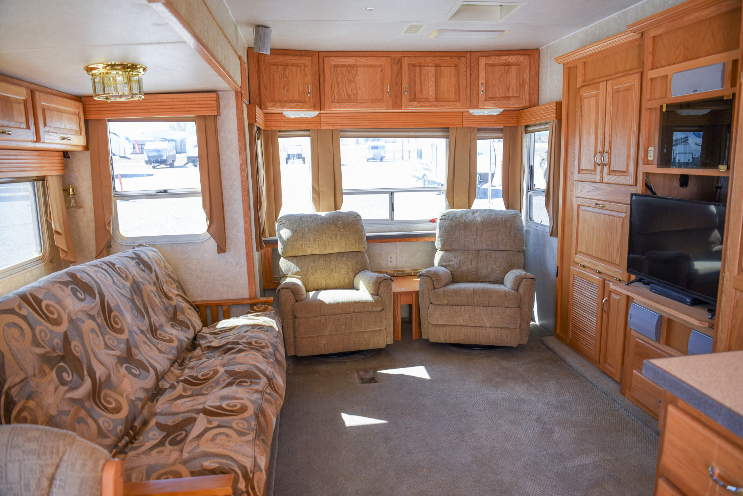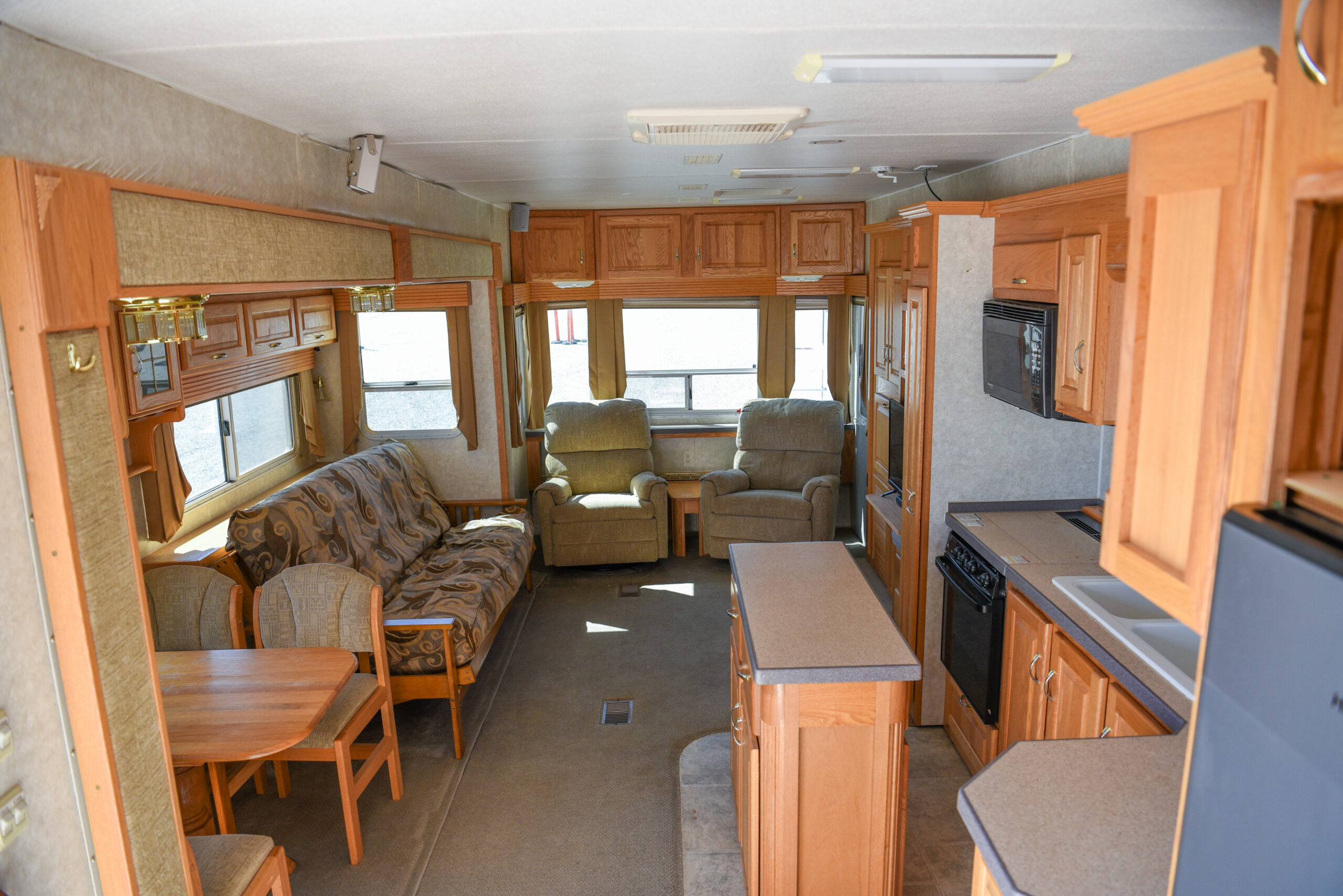 Handyman’s Special!  Four season.  Spacious 3 slides.  Beautiful island kitchen with exceptional storage.  Rear living area features sofa and twin recliners.  Great rear windows maximize natural light and bring scenic views in.  Entertainment center with LCD TV and desk area.  Spacious open bath.  Washer/dryer combo unit.  Great bedroom storage and walk-around bed.  Thermopane windows, fiberglass roof, electric awning and Onan 3600 generator.  This unit has some wood/water damage.