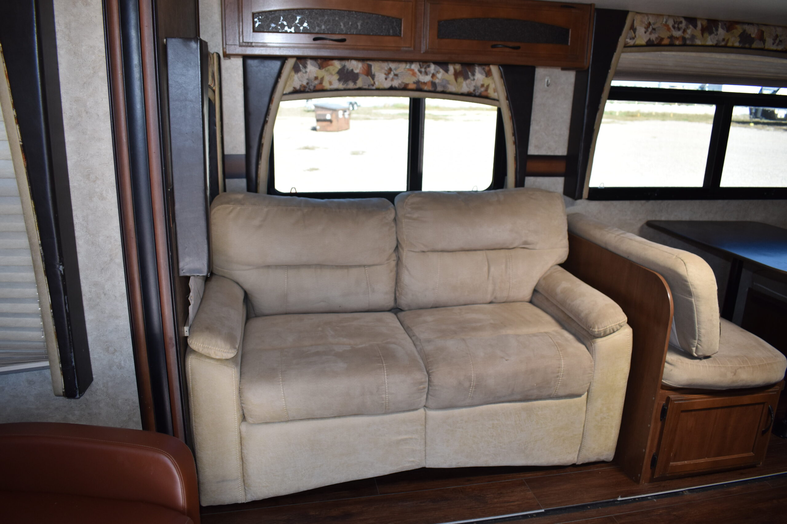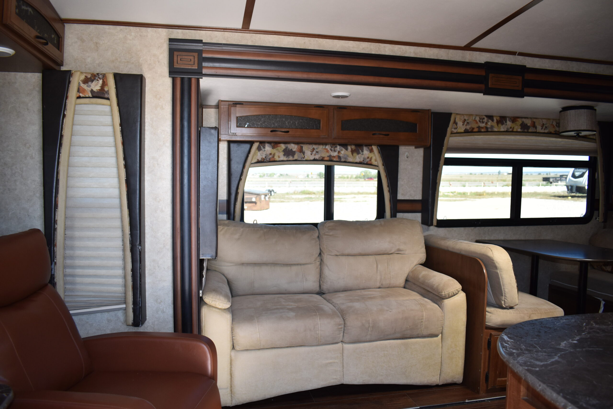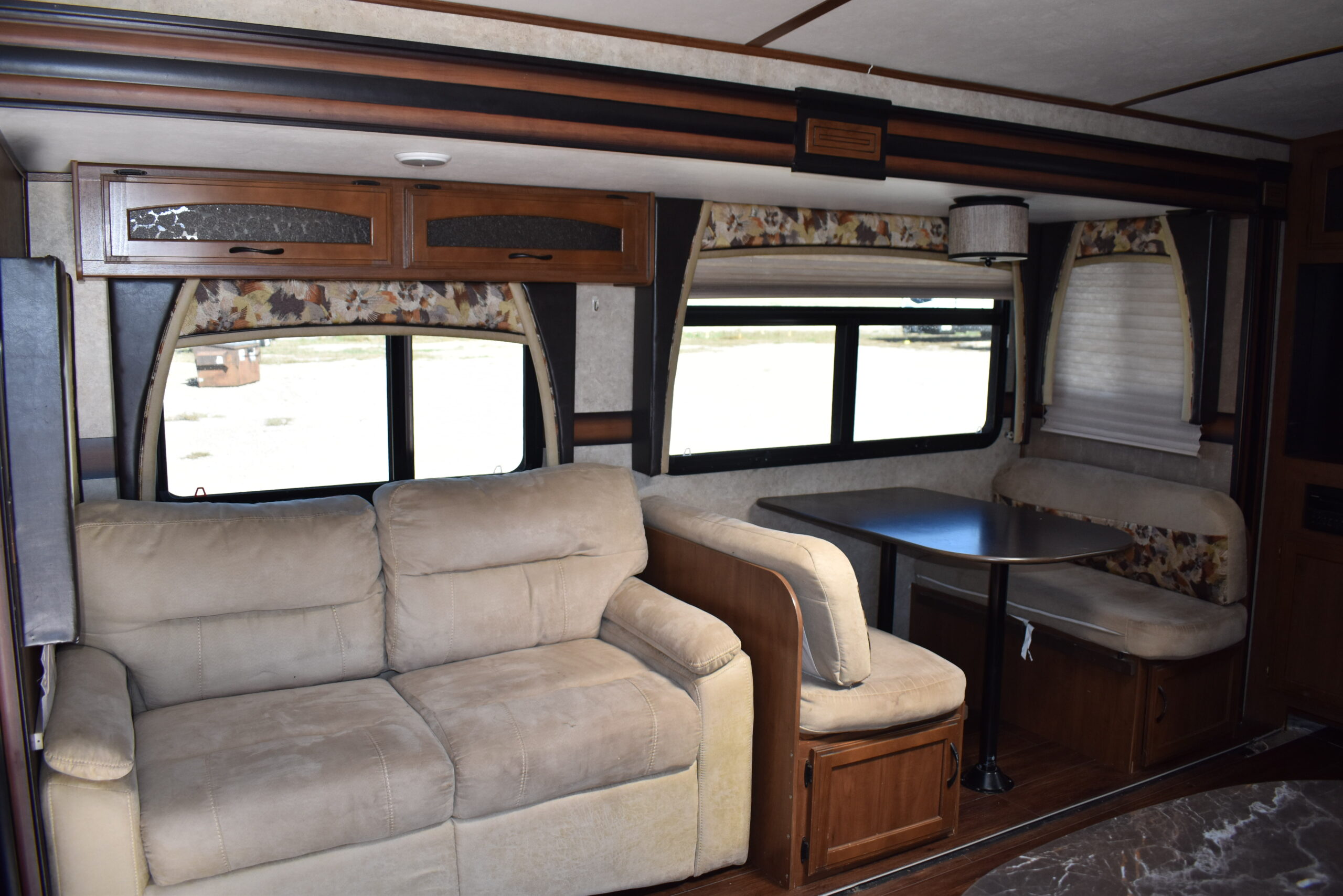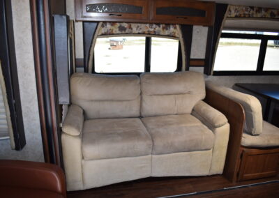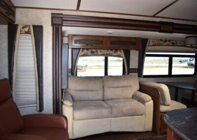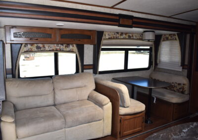 1 slide. Rear living floorplan with twin armchairs, sofa and great rear windows. Sofa and dinette provide additional sleeping space. Mid bath. Front bedroom with walk-around bed. 2 entrance doors, electric awning and power front hitch. This unit could use some cosmetic TLC- ideal for the handyperson or someone looking for a great canvas for a cosmetic renovation. Priced thousands below book value! All appliances are in working condition.