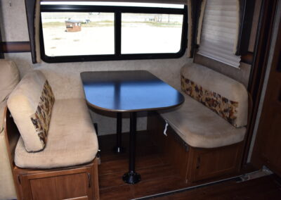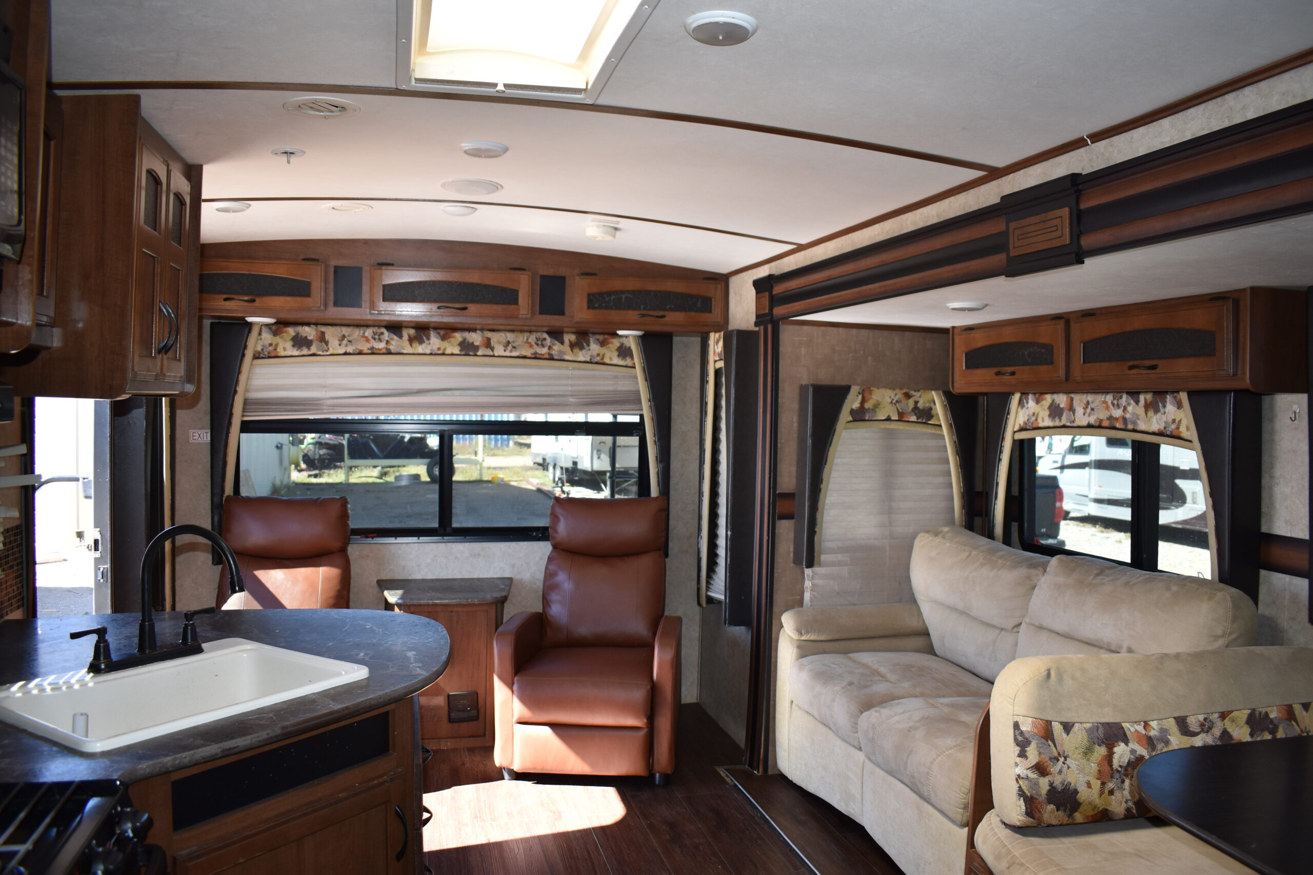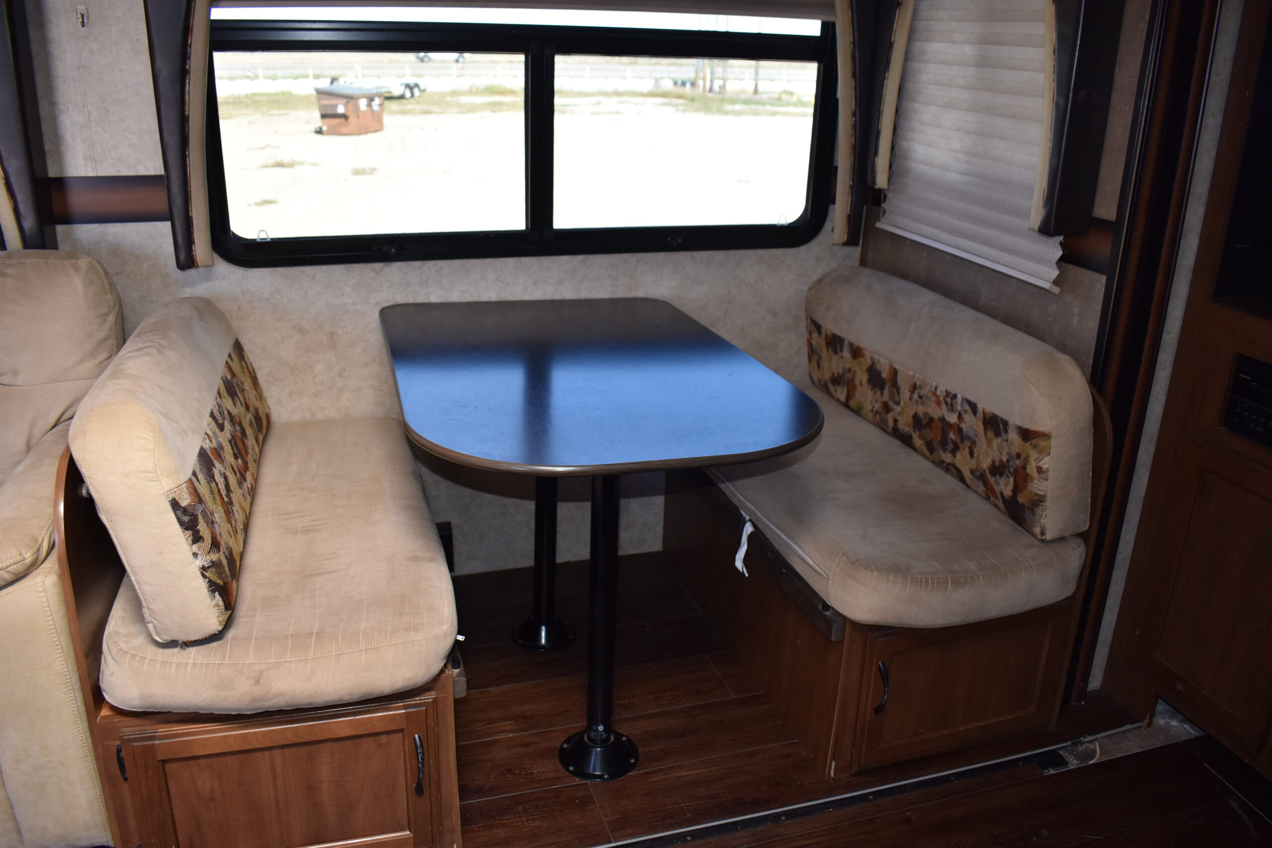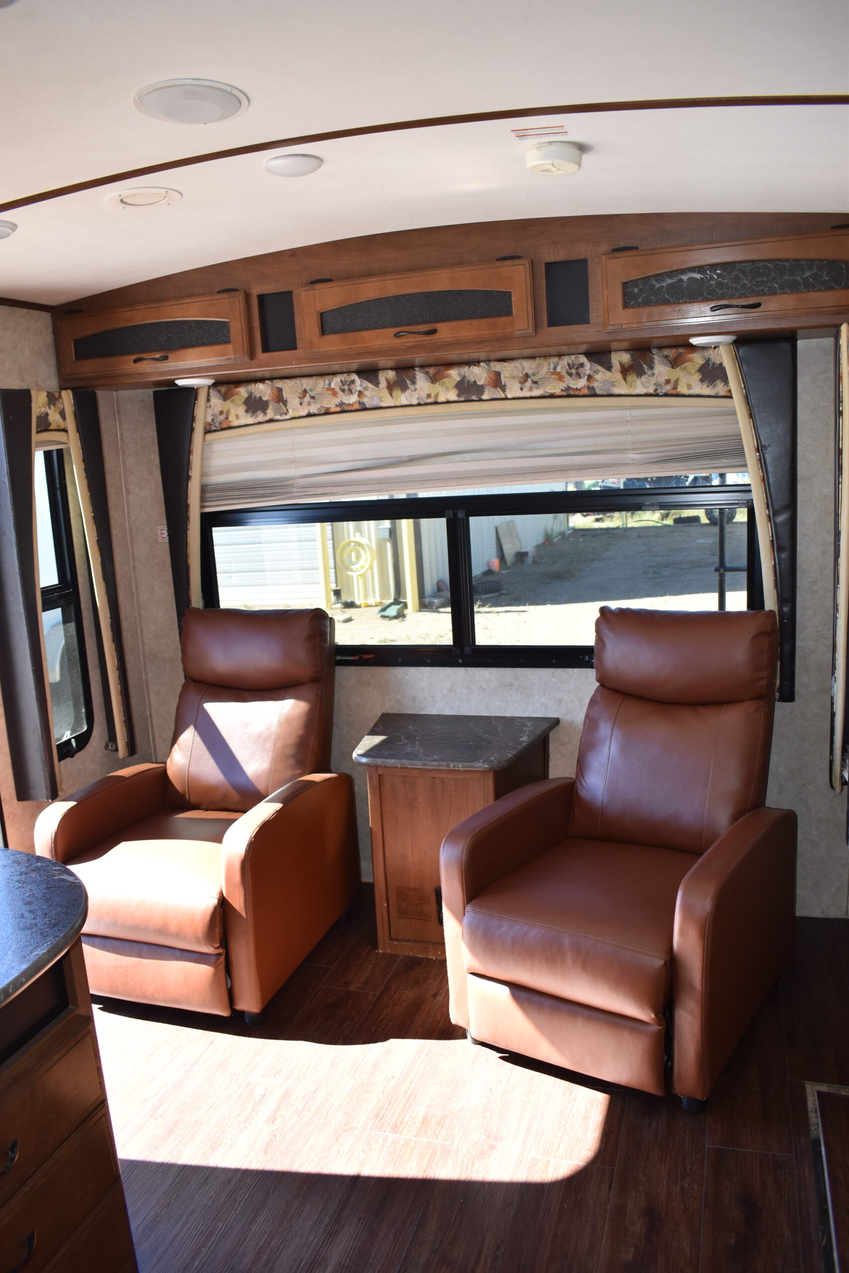 1 slide. Rear living floorplan with twin armchairs, sofa and great rear windows. Sofa and dinette provide additional sleeping space. Mid bath. Front bedroom with walk-around bed. 2 entrance doors, electric awning and power front hitch. This unit could use some cosmetic TLC- ideal for the handyperson or someone looking for a great canvas for a cosmetic renovation. Priced thousands below book value! All appliances are in working condition.