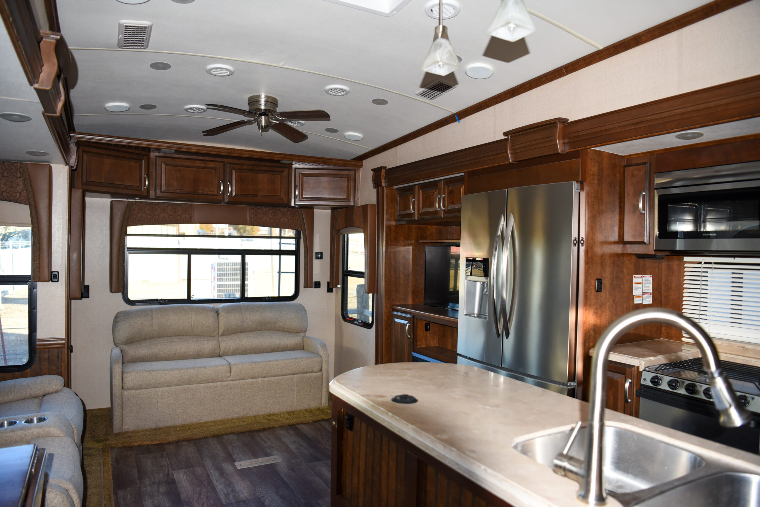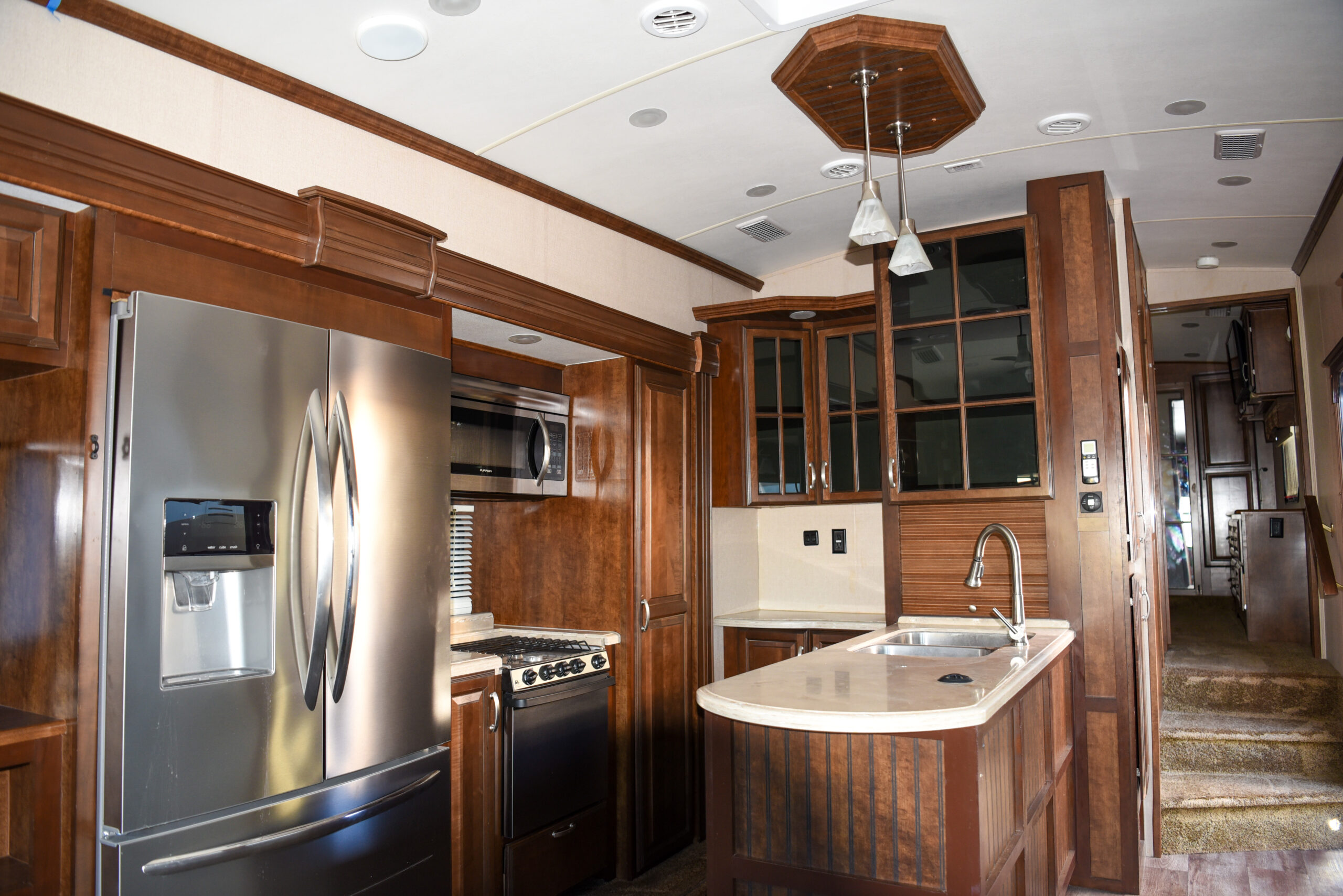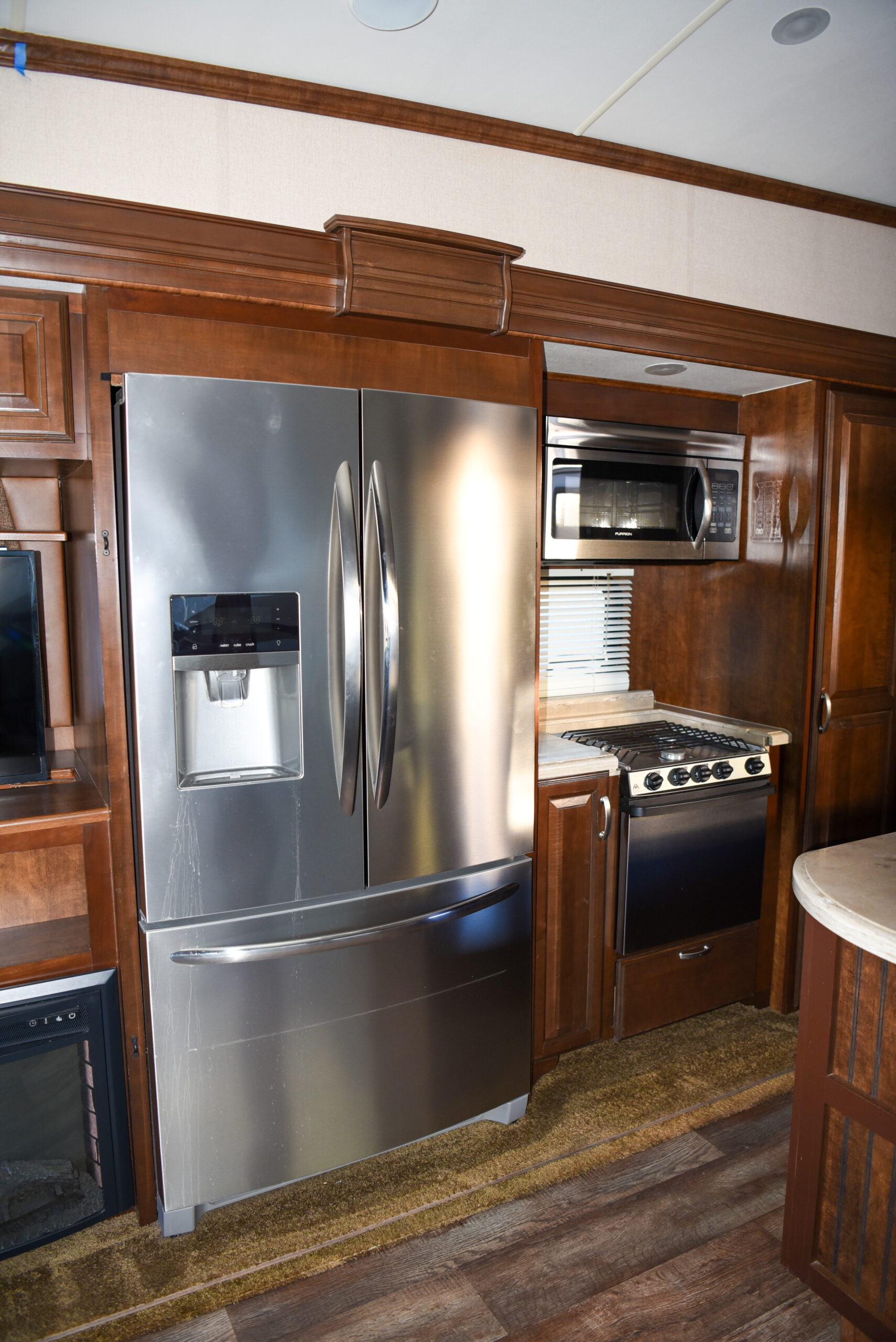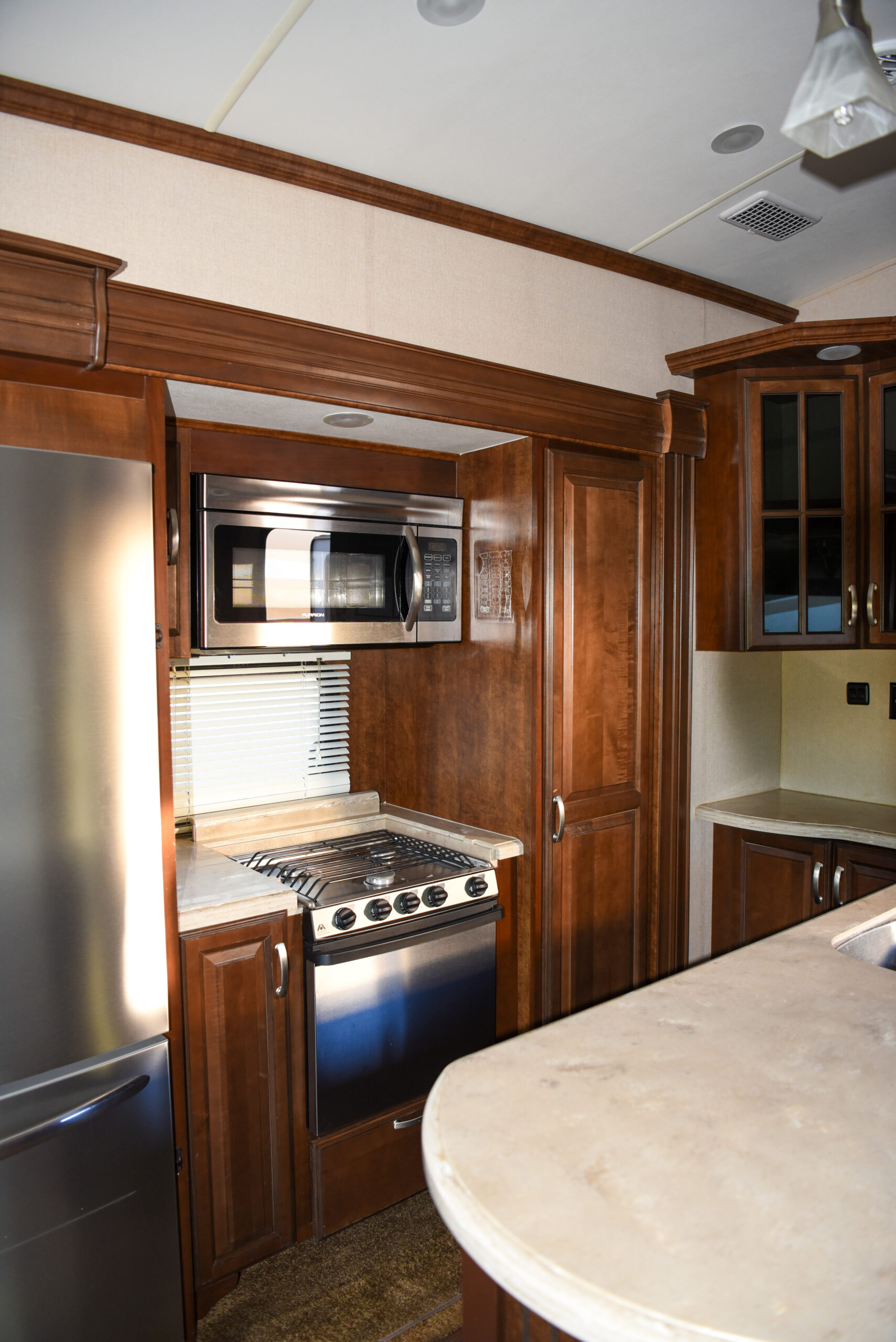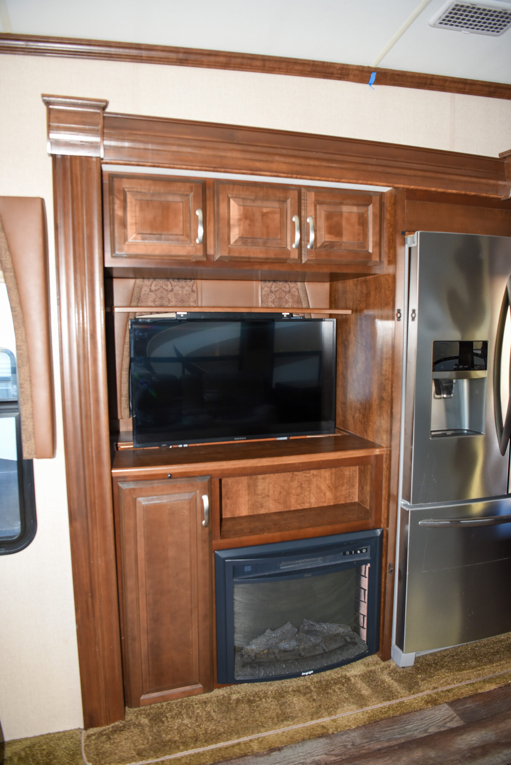 This spacious 3 slide 5th wheel features a beautiful u-shaped kitchen with great counter space and residential 3 door (electric only) refrigerator. Comfortable rear living area with with great windows. Sofa, theater-style seating, large LCD TV and electric fireplace. Enclosed bathroom with spacious walk-in shower. Bedroom features walk-around king bed, LCD TV and exceptional storage space. 2 electric awnings and enclosed and heated underbelly.
