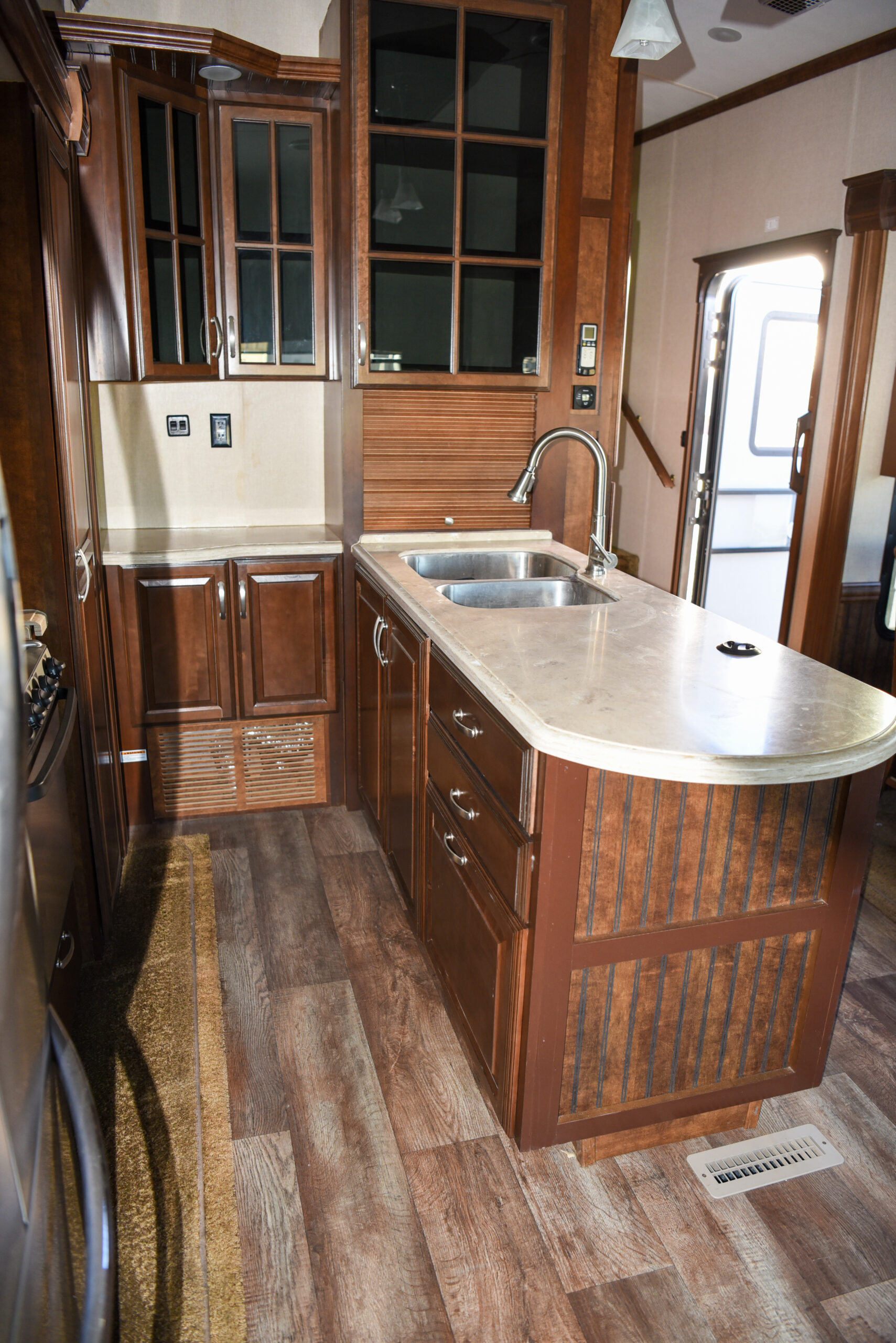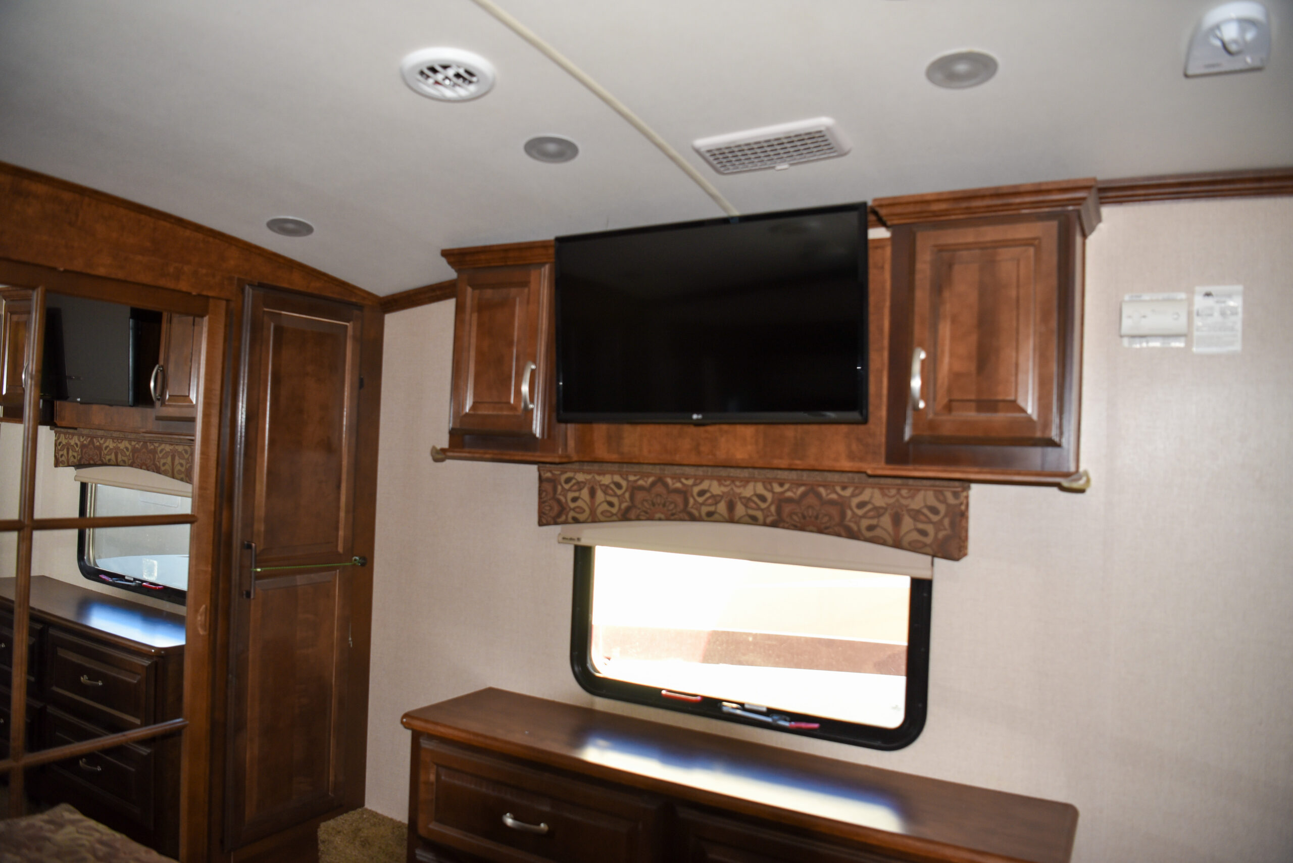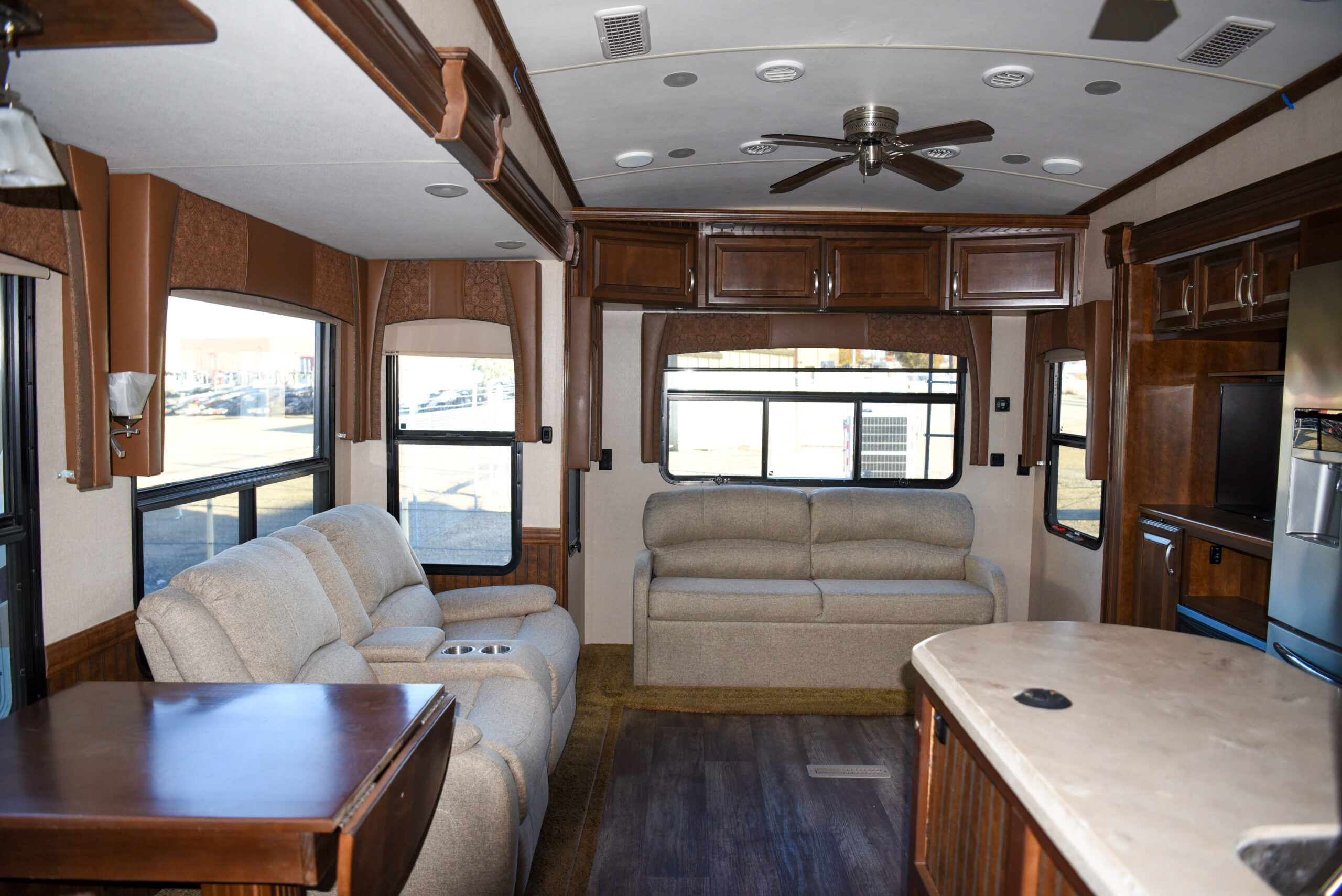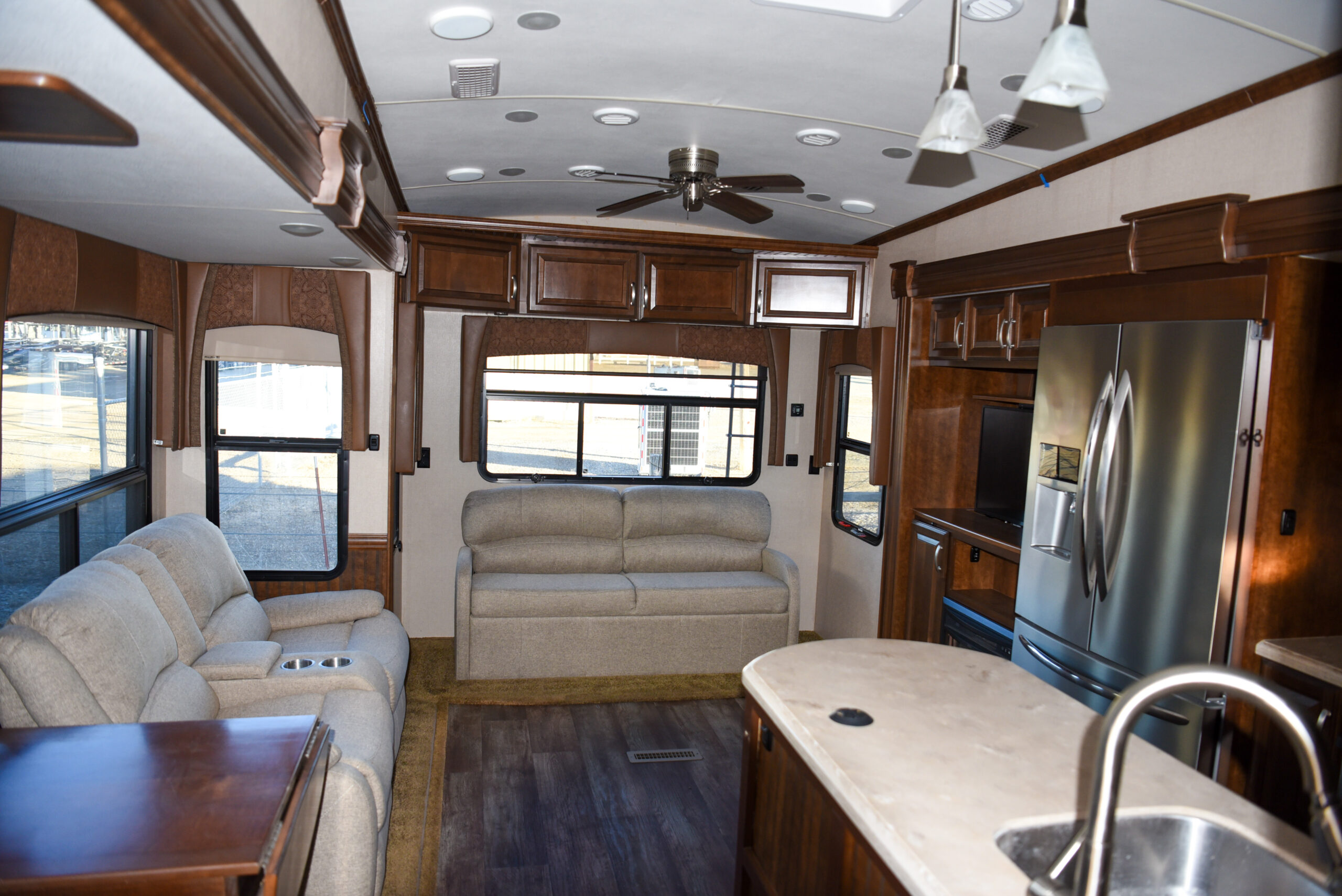 This spacious 3 slide 5th wheel features a beautiful u-shaped kitchen with great counter space and residential 3 door (electric only) refrigerator. Comfortable rear living area with with great windows. Sofa, theater-style seating, large LCD TV and electric fireplace. Enclosed bathroom with spacious walk-in shower. Bedroom features walk-around king bed, LCD TV and exceptional storage space. 2 electric awnings and enclosed and heated underbelly.
