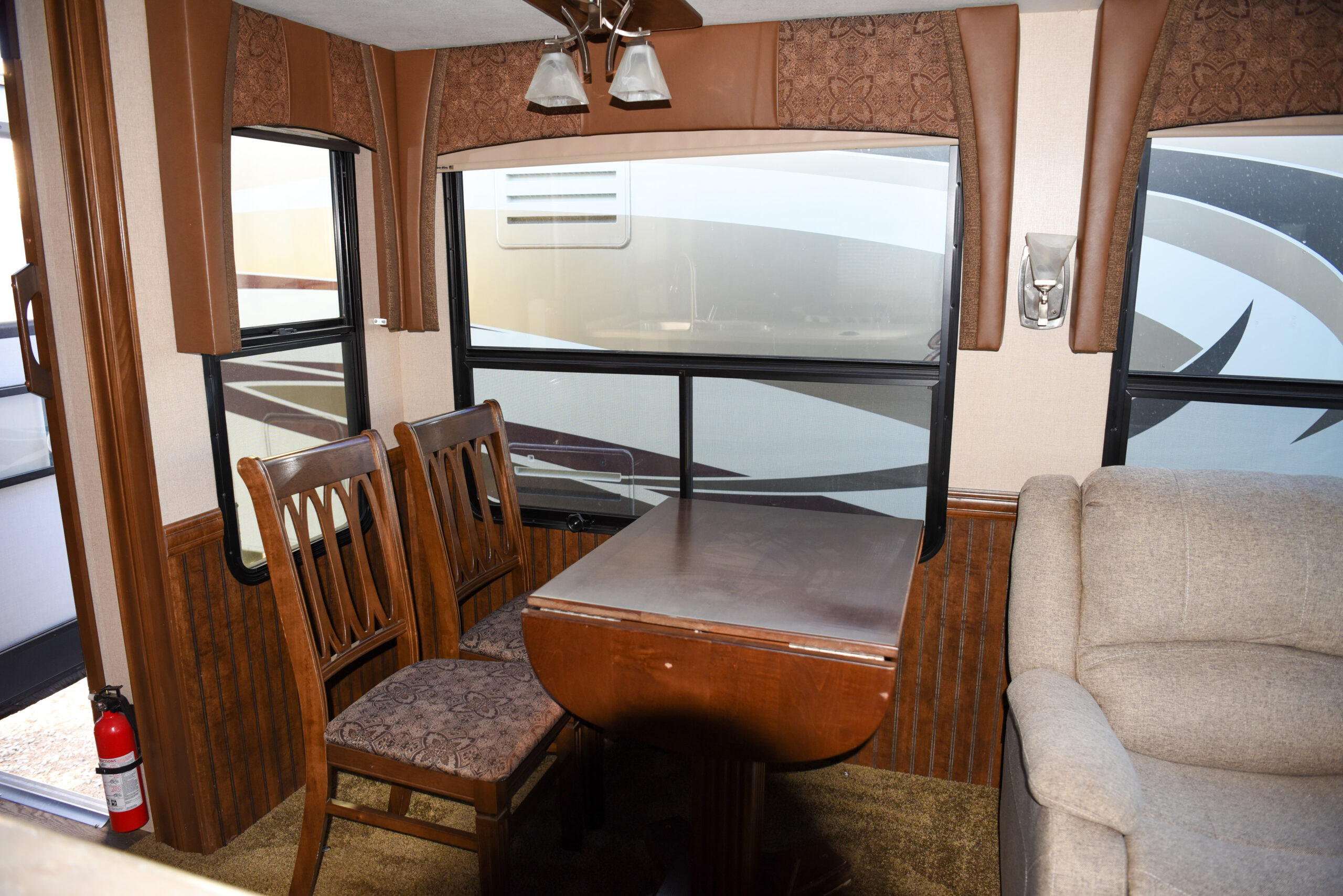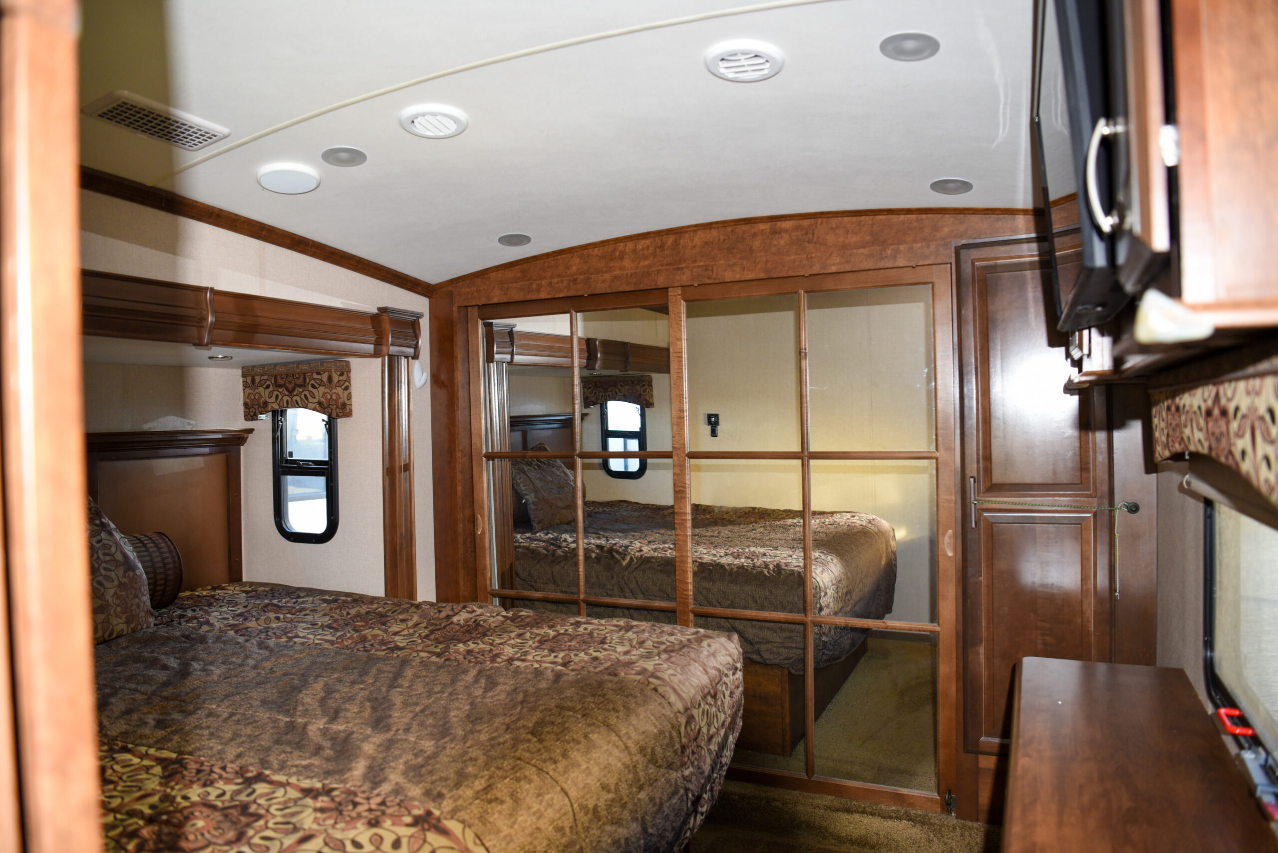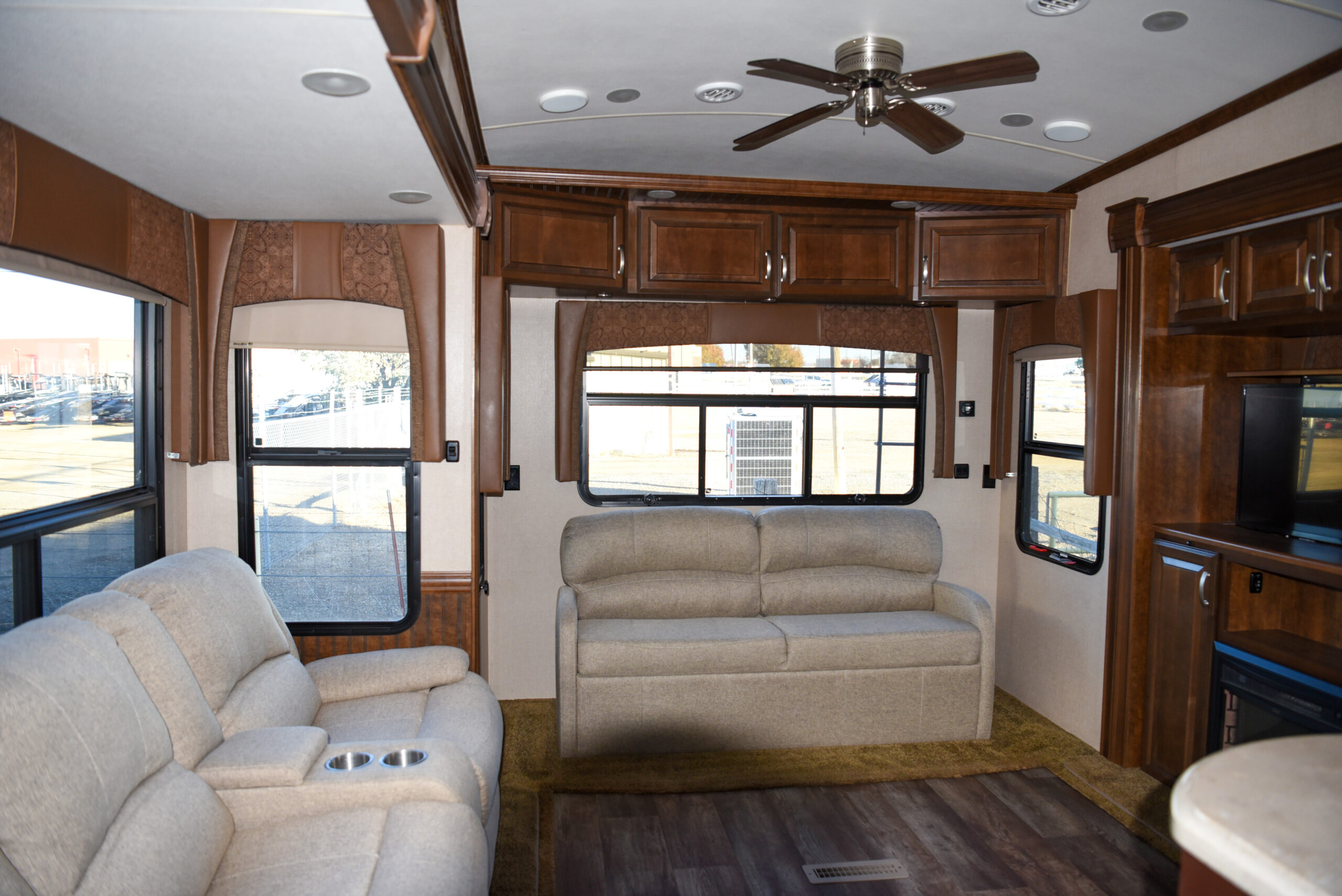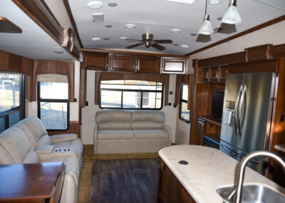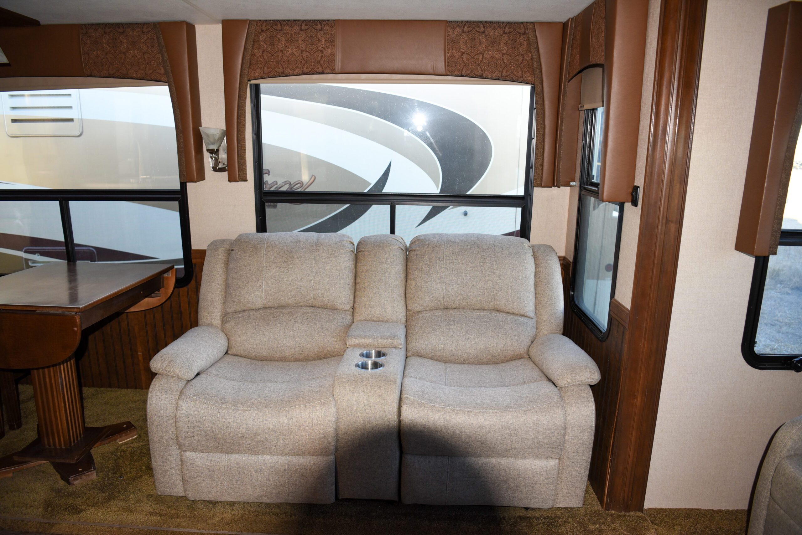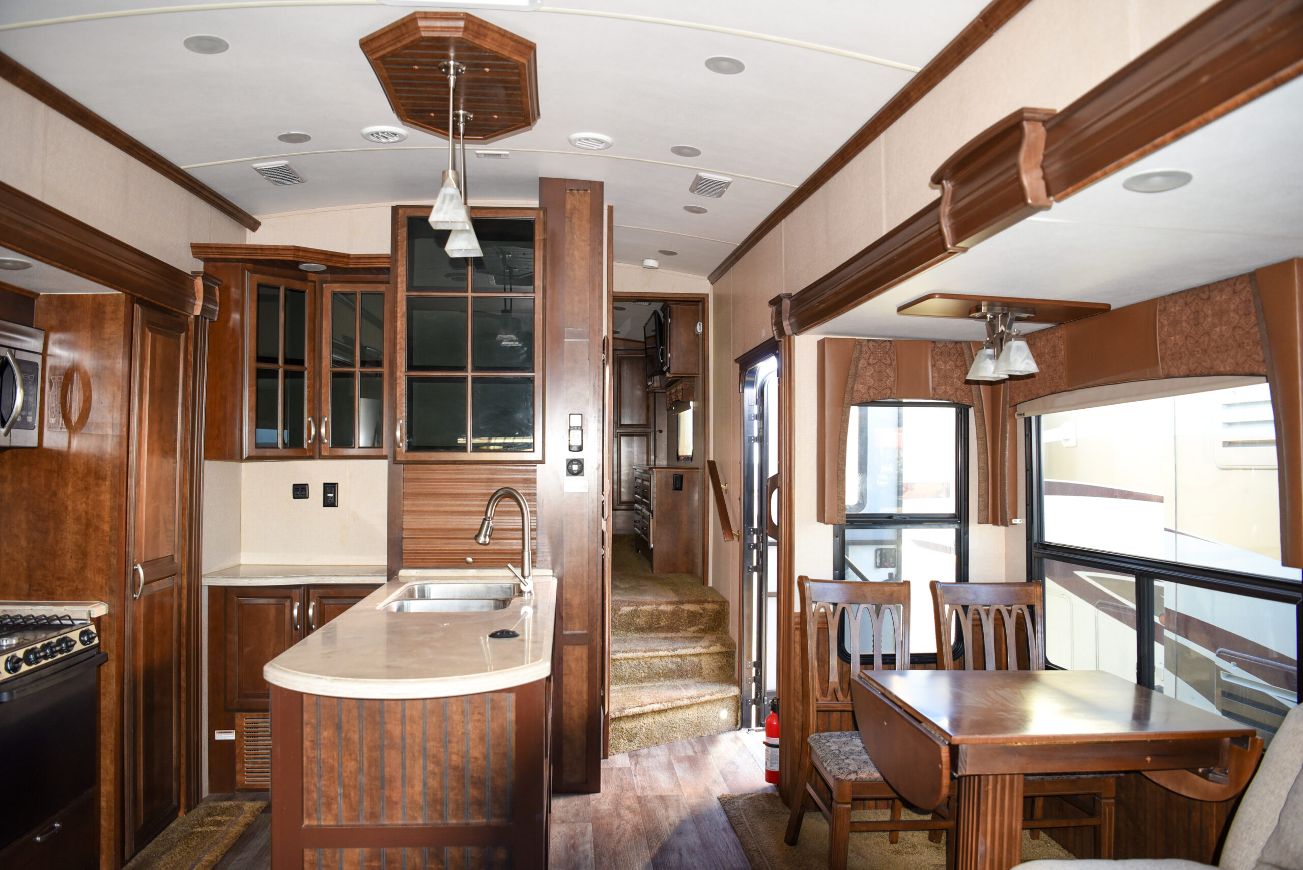 This spacious 3 slide 5th wheel features a beautiful u-shaped kitchen with great counter space and residential 3 door (electric only) refrigerator. Comfortable rear living area with with great windows. Sofa, theater-style seating, large LCD TV and electric fireplace. Enclosed bathroom with spacious walk-in shower. Bedroom features walk-around king bed, LCD TV and exceptional storage space. 2 electric awnings and enclosed and heated underbelly.