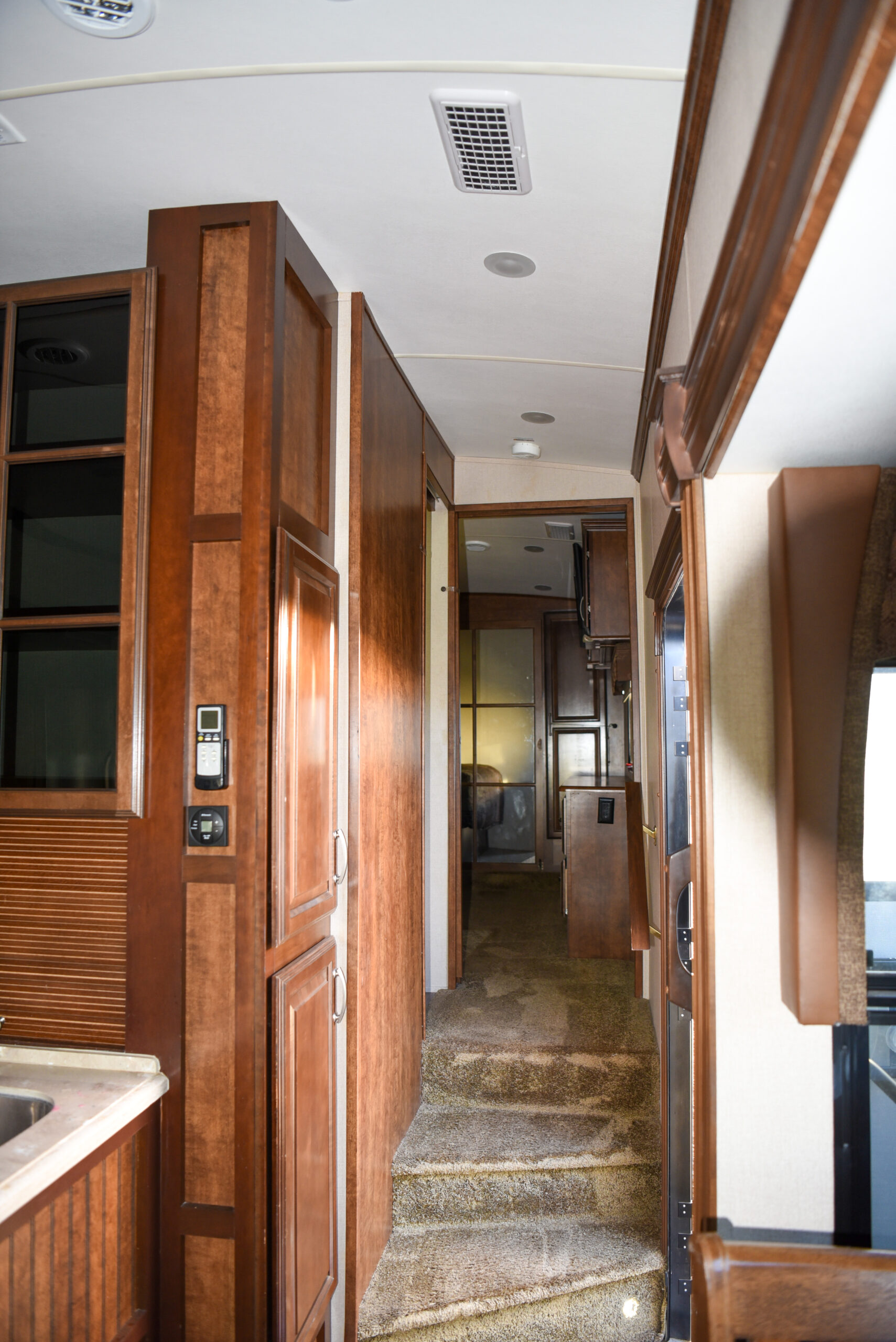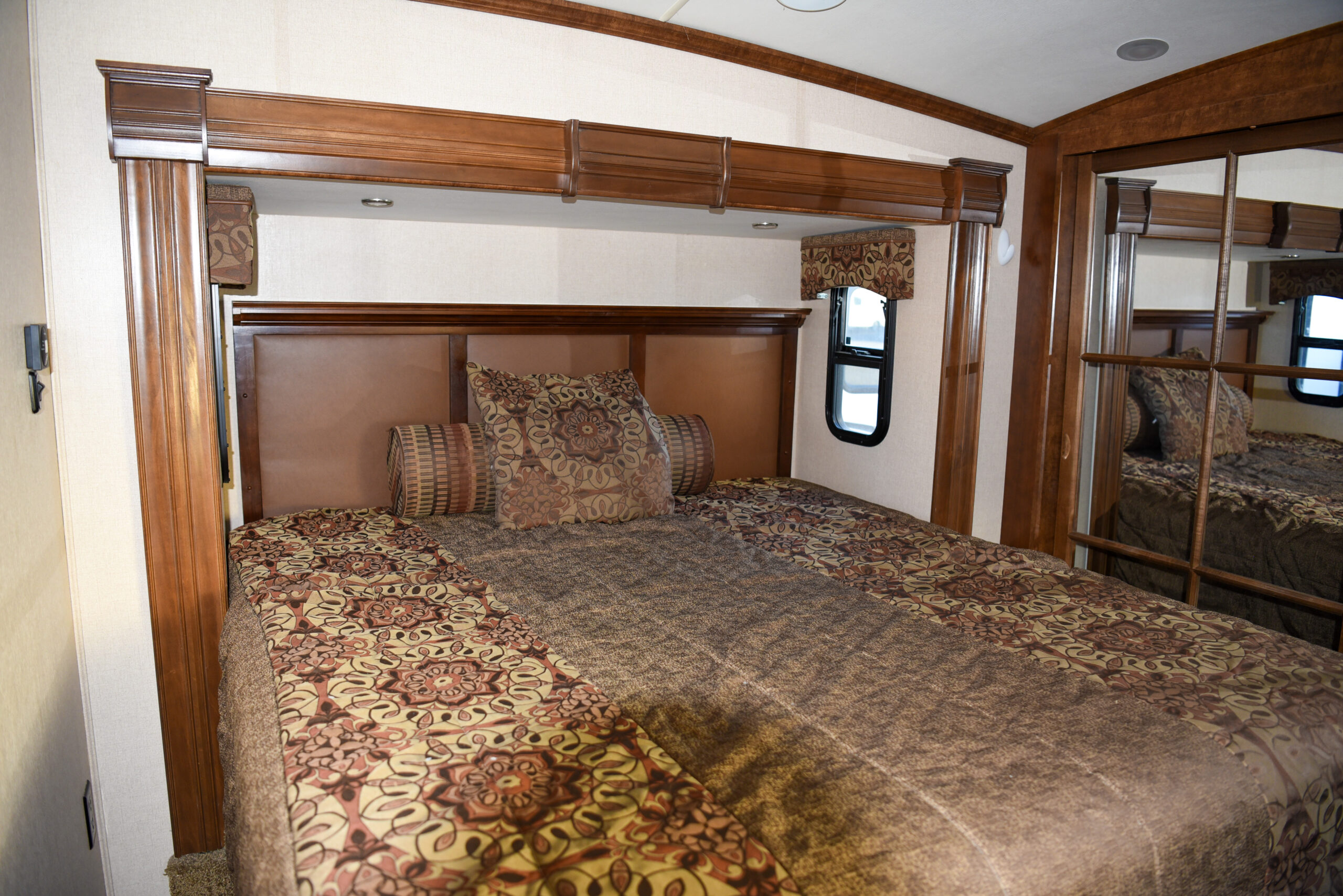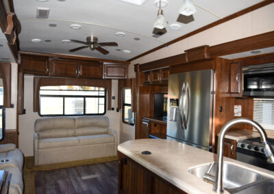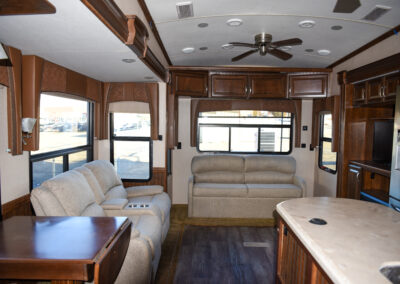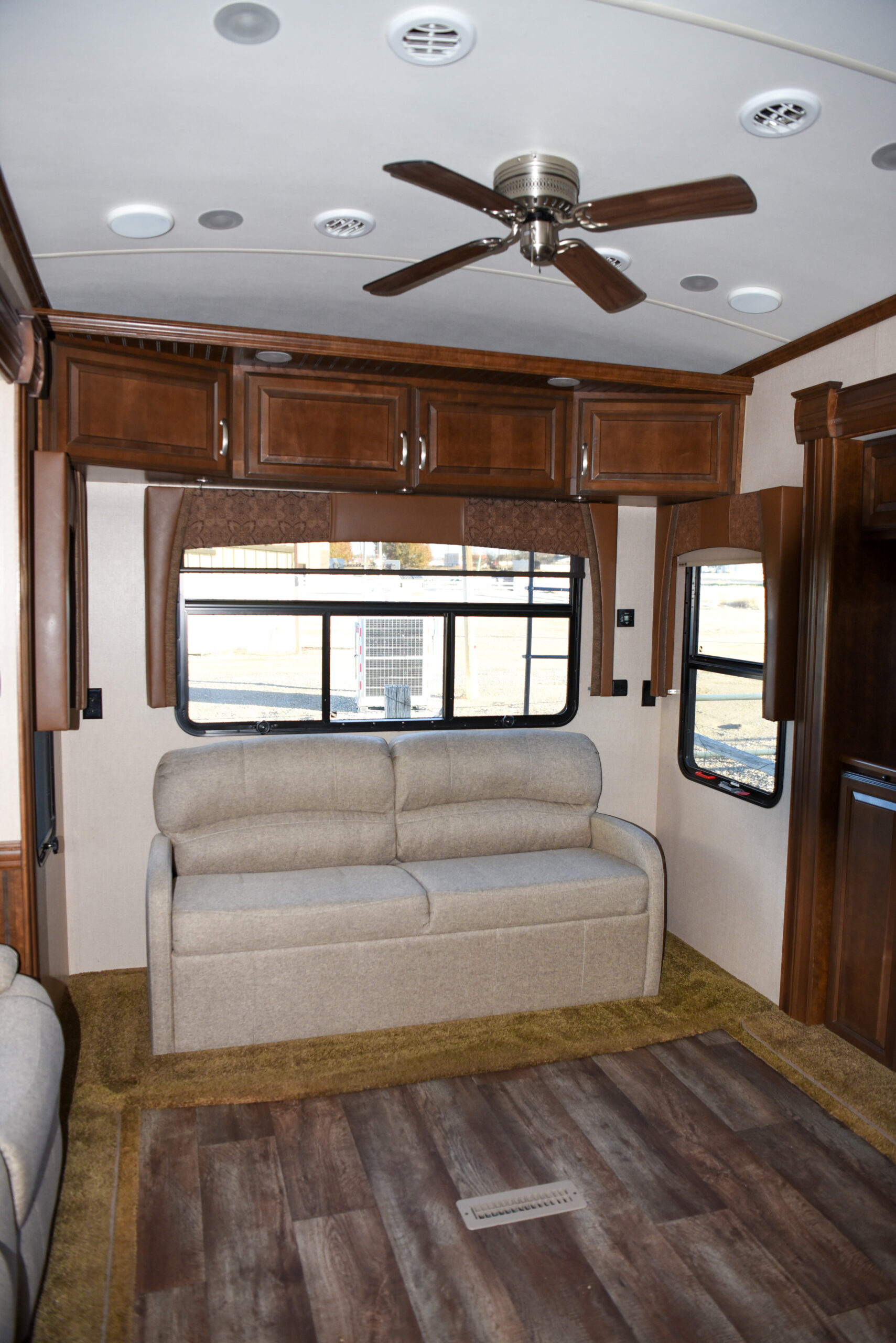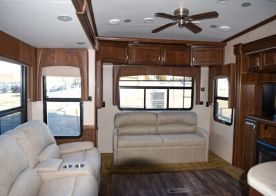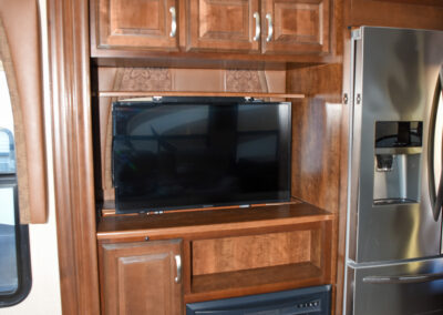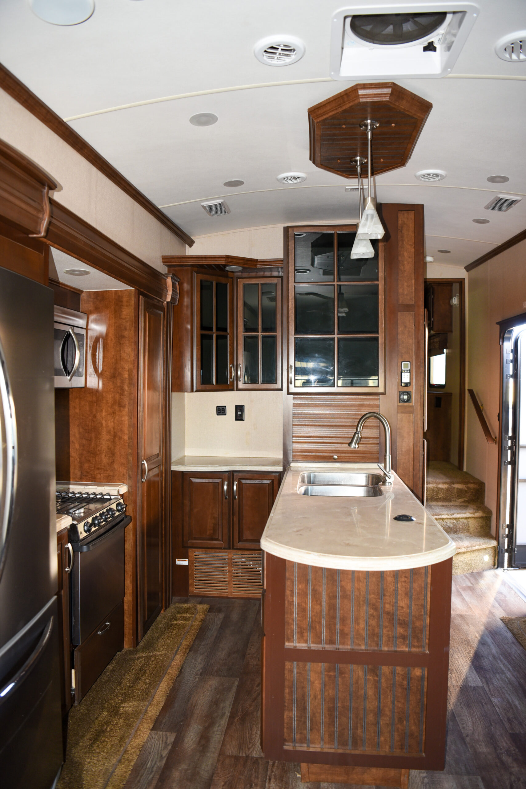 This spacious 3 slide 5th wheel features a beautiful u-shaped kitchen with great counter space and residential 3 door (electric only) refrigerator. Comfortable rear living area with with great windows. Sofa, theater-style seating, large LCD TV and electric fireplace. Enclosed bathroom with spacious walk-in shower. Bedroom features walk-around king bed, LCD TV and exceptional storage space. 2 electric awnings and enclosed and heated underbelly.