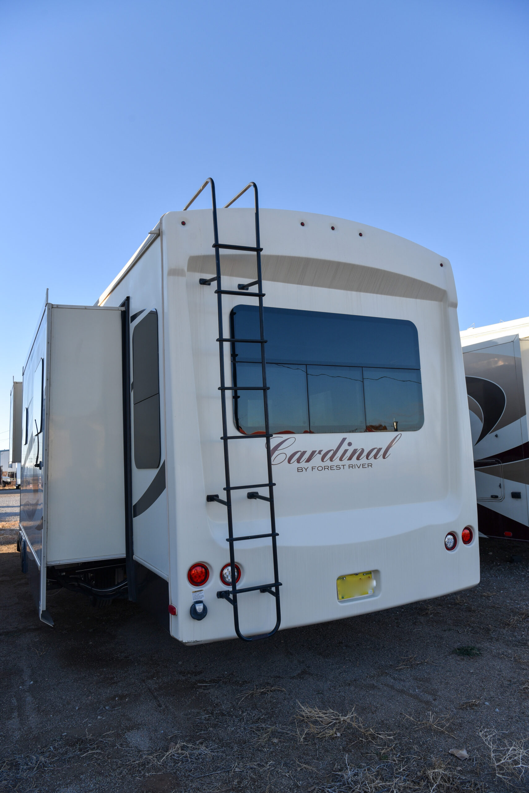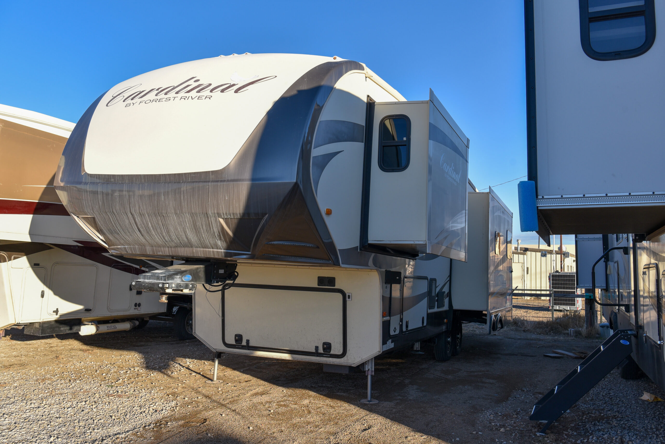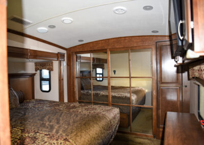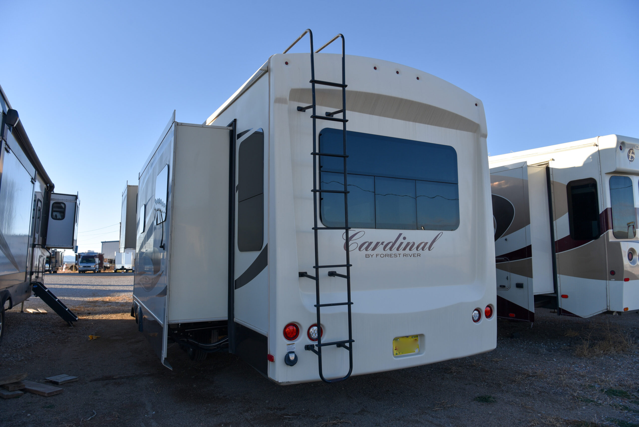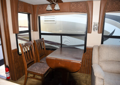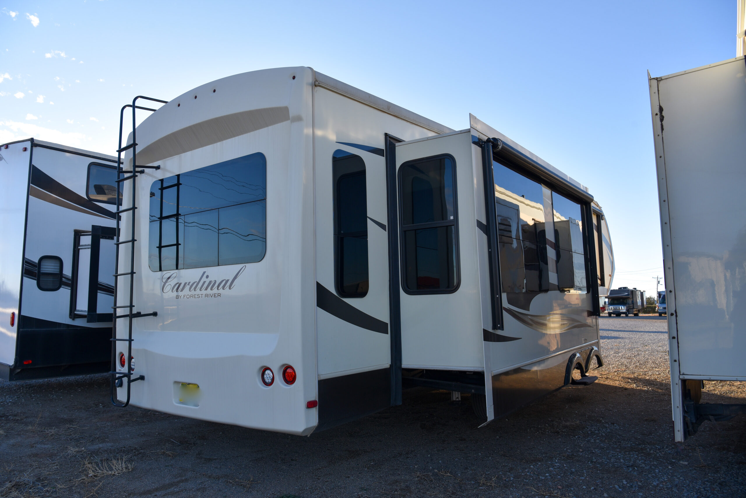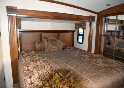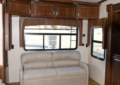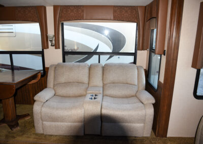 This spacious 3 slide 5th wheel features a beautiful u-shaped kitchen with great counter space and residential 3 door (electric only) refrigerator. Comfortable rear living area with with great windows. Sofa, theater-style seating, large LCD TV and electric fireplace. Enclosed bathroom with spacious walk-in shower. Bedroom features walk-around king bed, LCD TV and exceptional storage space. 2 electric awnings and enclosed and heated underbelly.