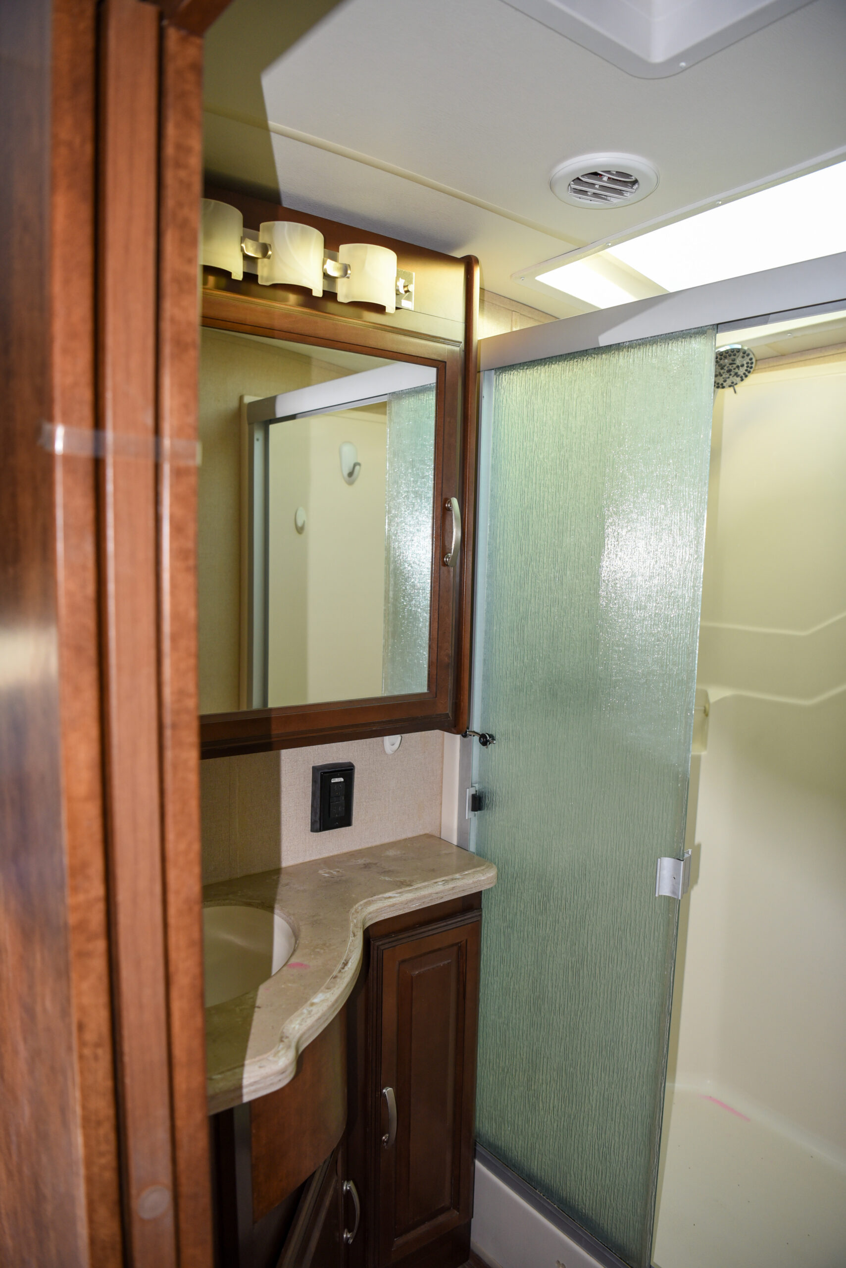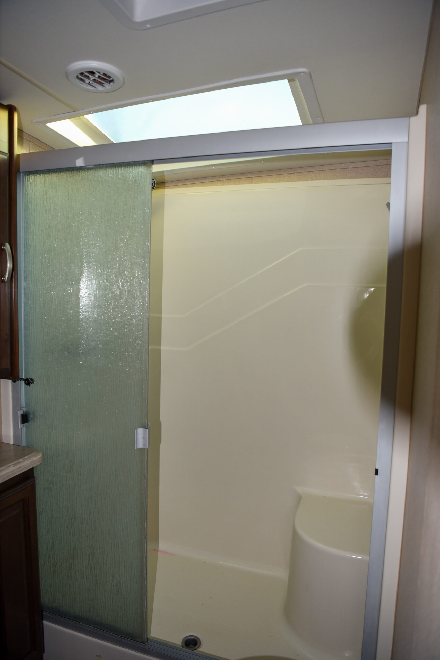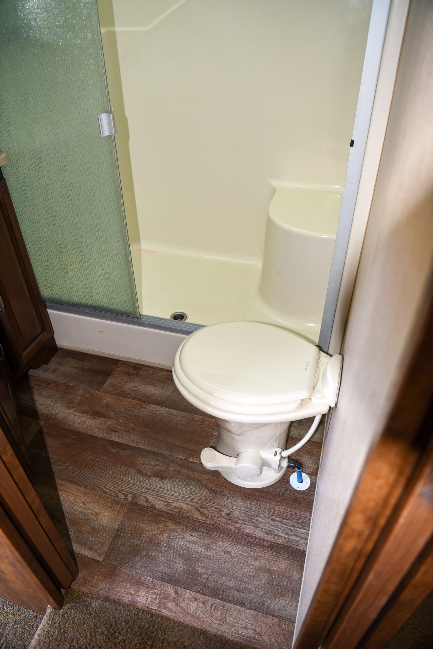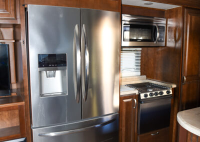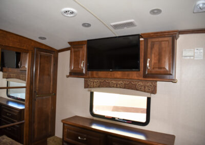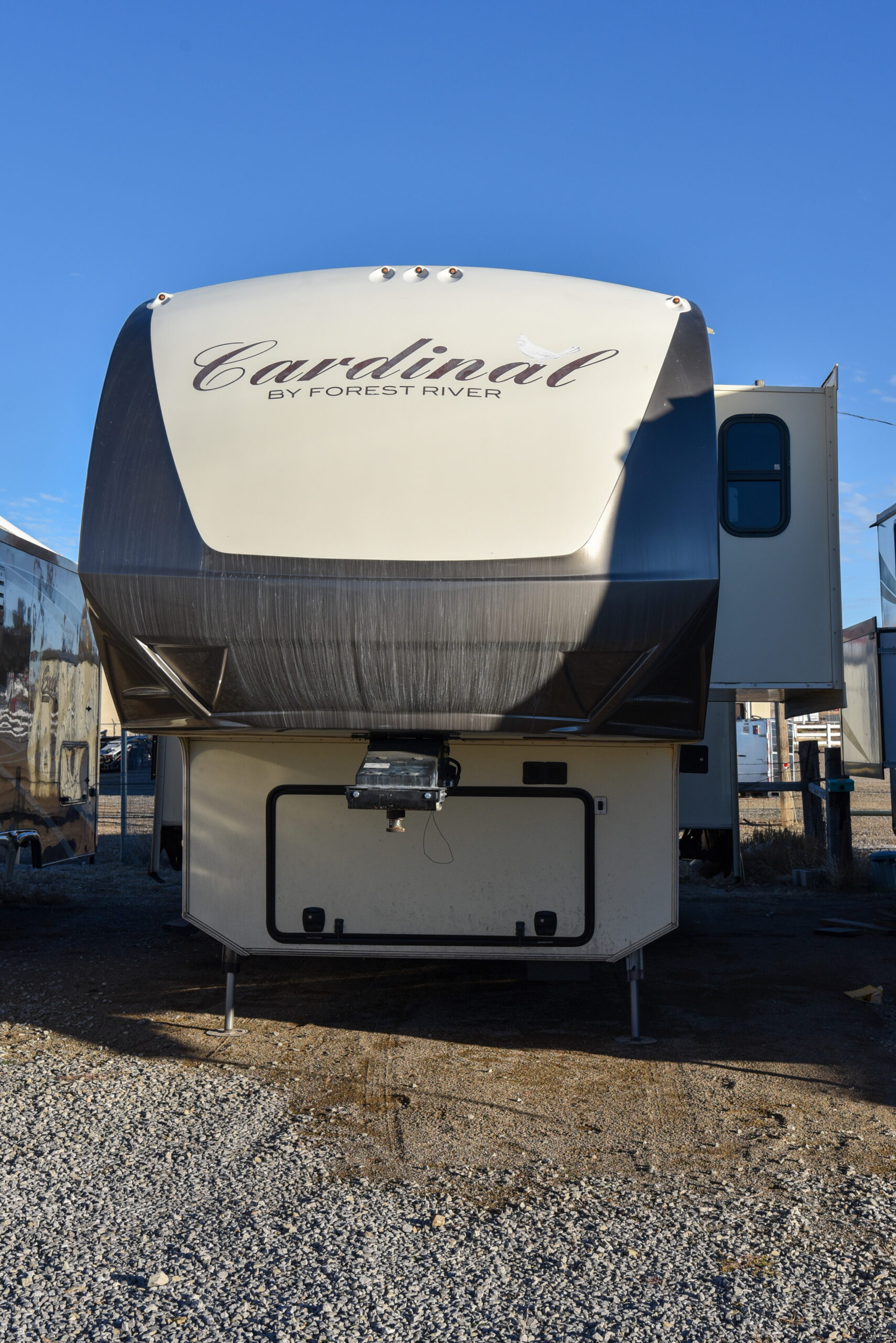 This spacious 3 slide 5th wheel features a beautiful u-shaped kitchen with great counter space and residential 3 door (electric only) refrigerator. Comfortable rear living area with with great windows. Sofa, theater-style seating, large LCD TV and electric fireplace. Enclosed bathroom with spacious walk-in shower. Bedroom features walk-around king bed, LCD TV and exceptional storage space. 2 electric awnings and enclosed and heated underbelly.