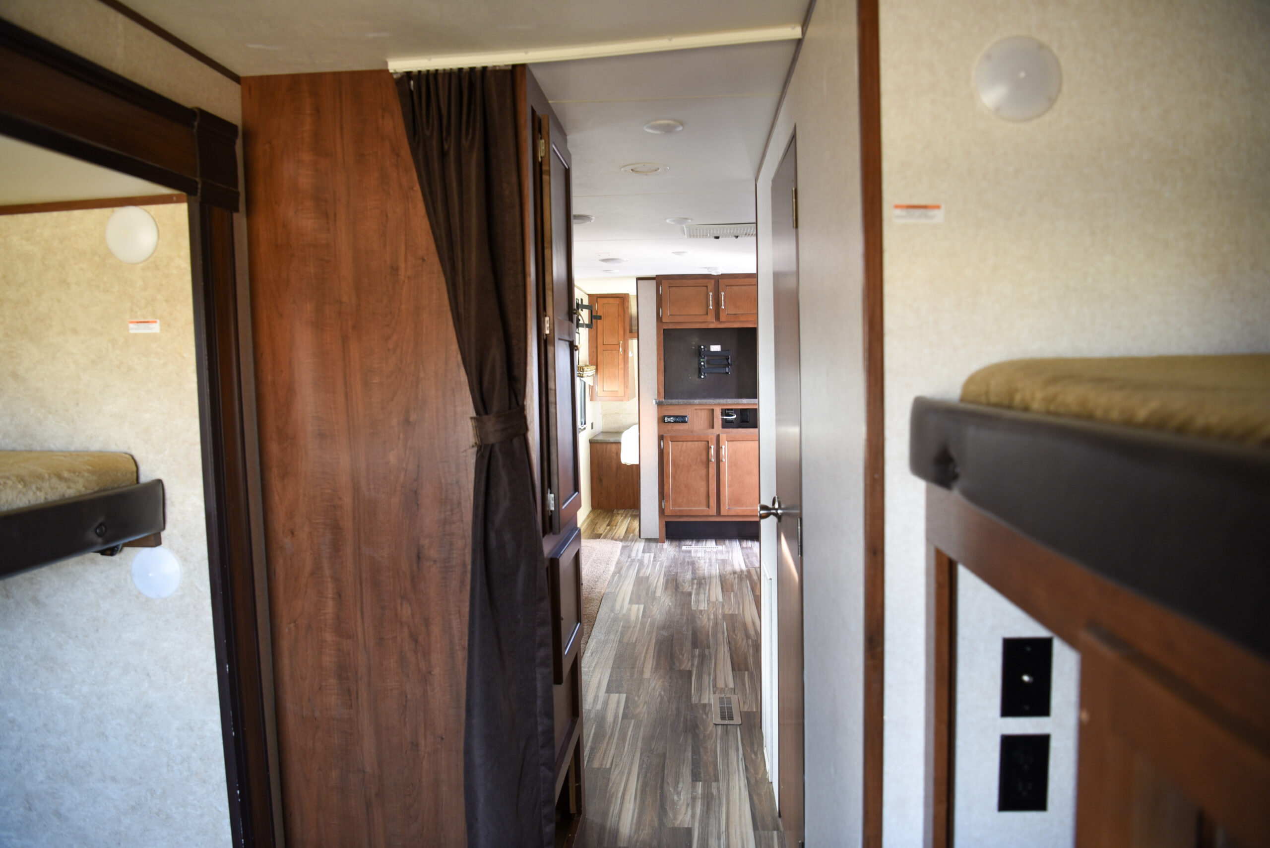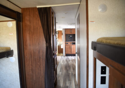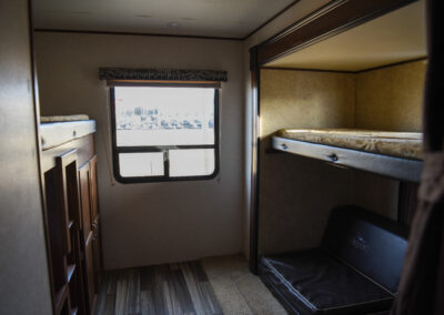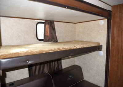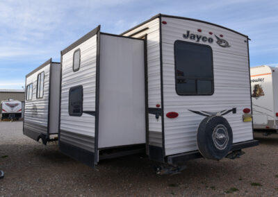 Great bunk house for the entire family and outdoor kitchen for ultimate entertaining all summer long!  Spacious 2 slide floorplan.  Sleeps up to 10.  Great kitchen and comfortable living area.  U-shaped dinette seats the entire family.  Mid enclosed bathroom.  Rear separate bunk room with 2 twin bunks, sofa converts to double sleeper and great storage.  Front master bed.  2 entrance doors and electric and awning.  Outdoor kitchen with grill, sink and mini fridge.
