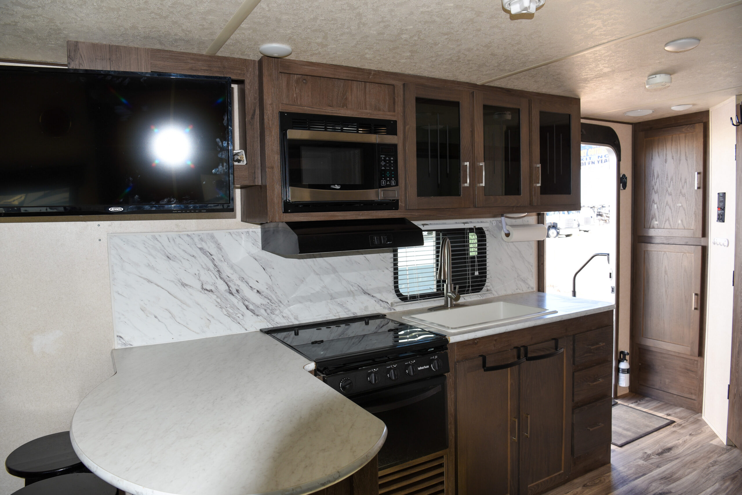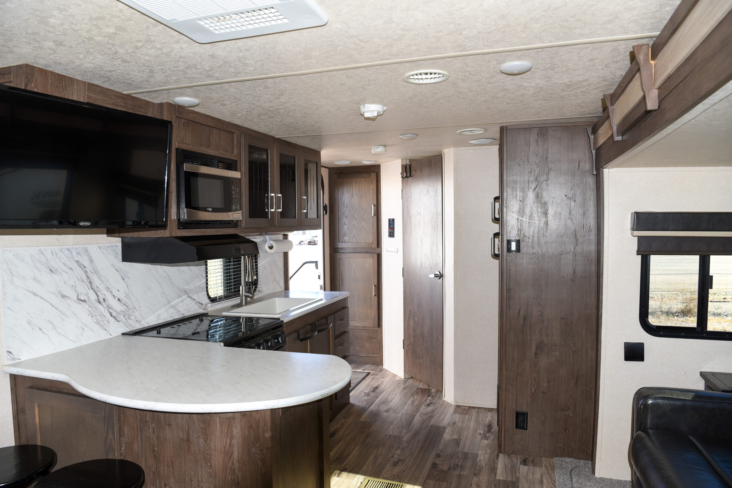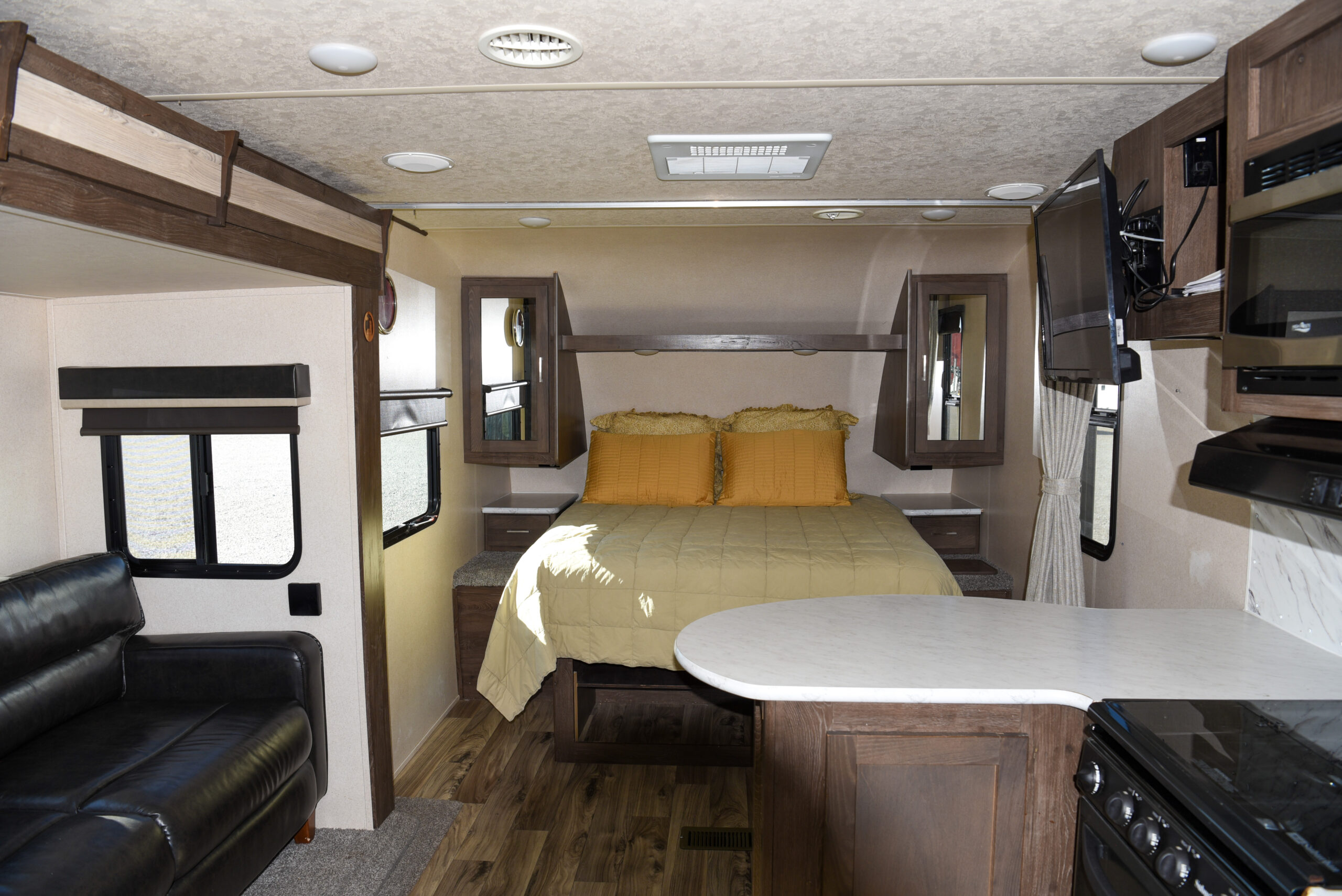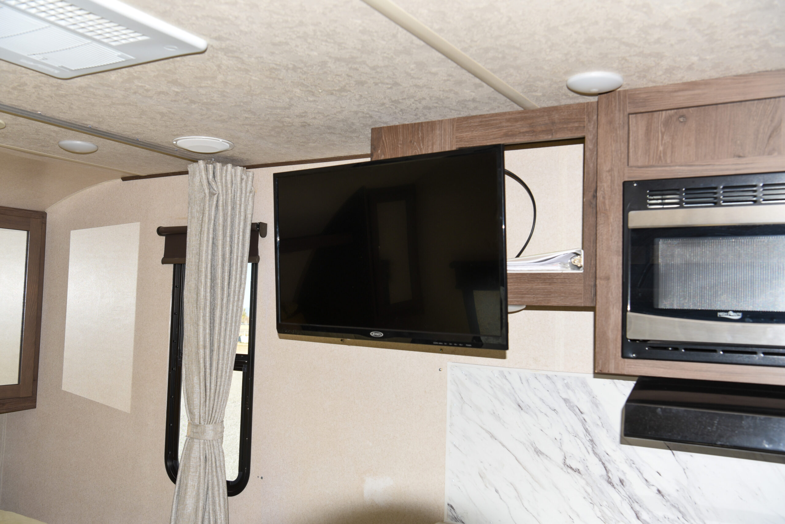 Great 1 slide floorplan. Comfortable living area with sofa and LCD TV. L-shaped kitchen with great counter space and bar stool seating. Front bedroom with walk-around bed and convenient under-bed storage. Rear enclosed bathroom. Electric awning, power front hitch and upgraded entry steps.