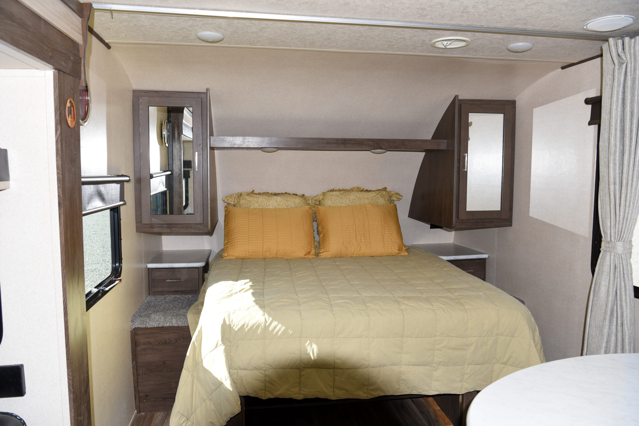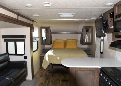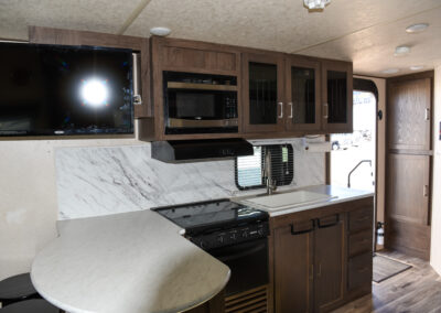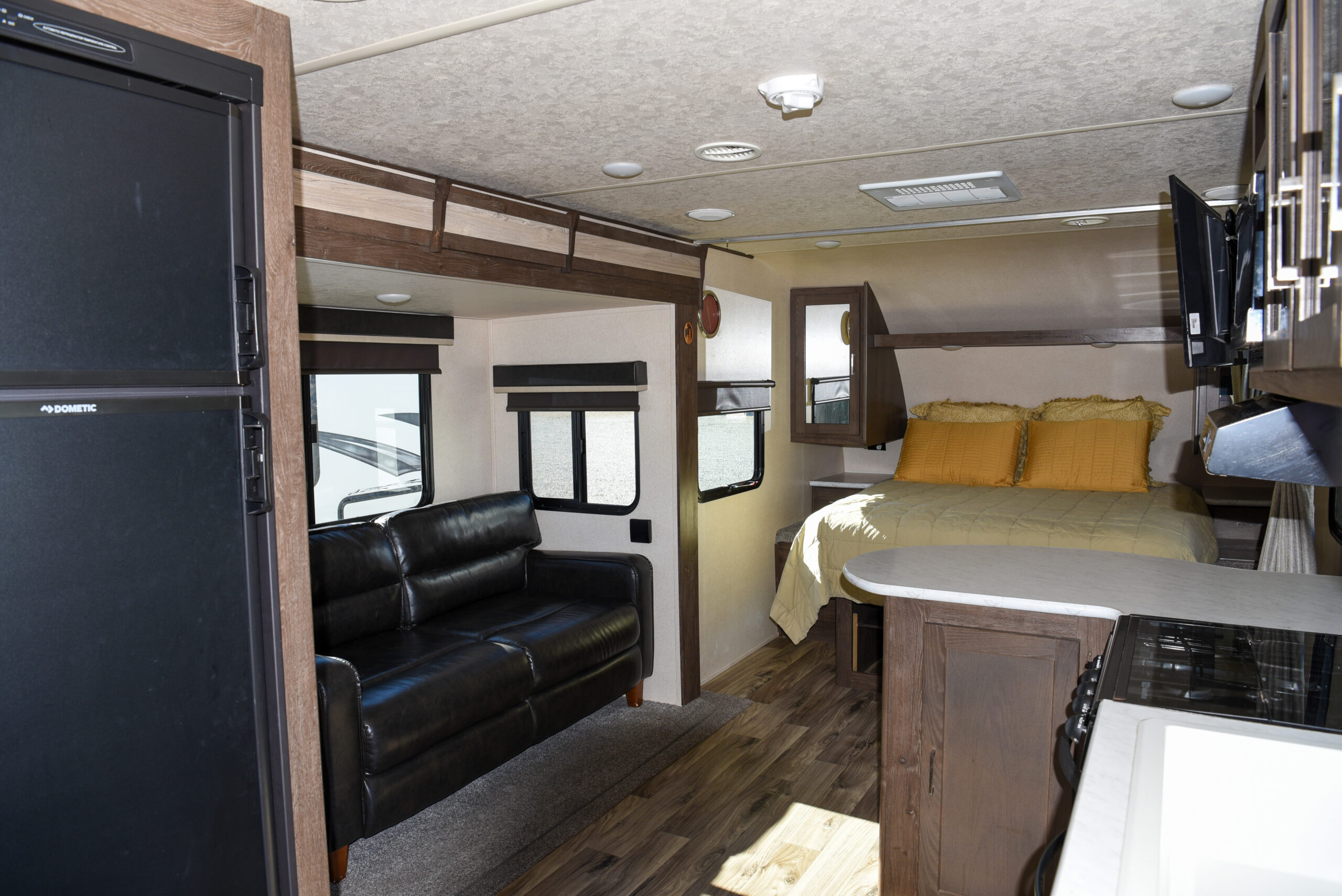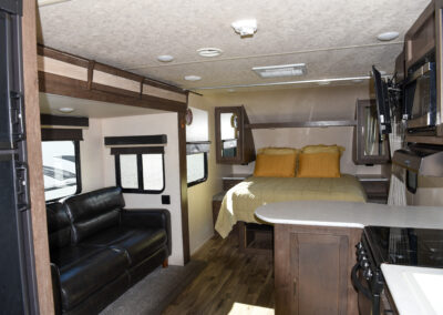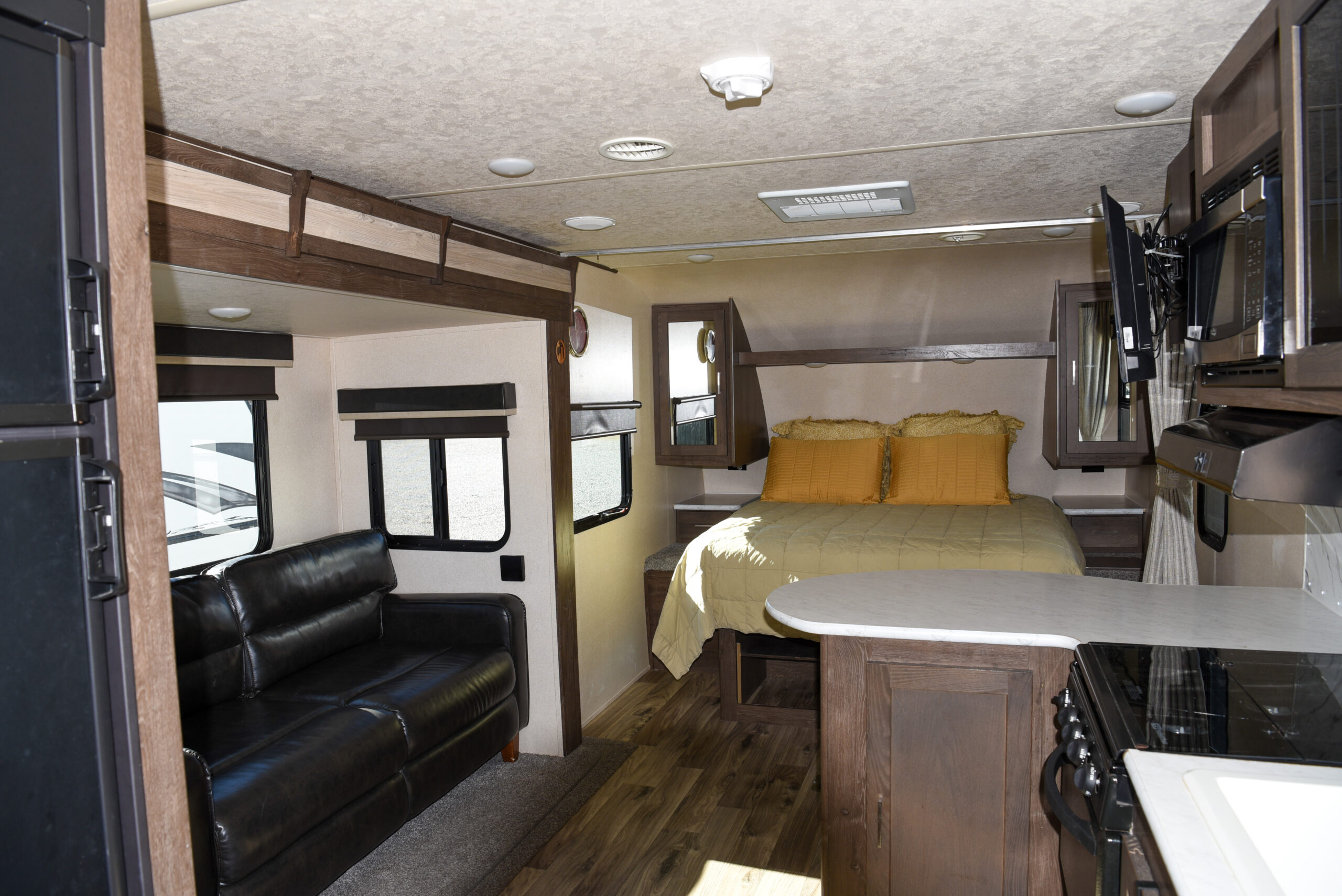 Great 1 slide floorplan. Comfortable living area with sofa and LCD TV. L-shaped kitchen with great counter space and bar stool seating. Front bedroom with walk-around bed and convenient under-bed storage. Rear enclosed bathroom. Electric awning, power front hitch and upgraded entry steps.