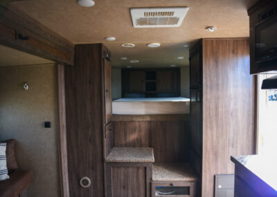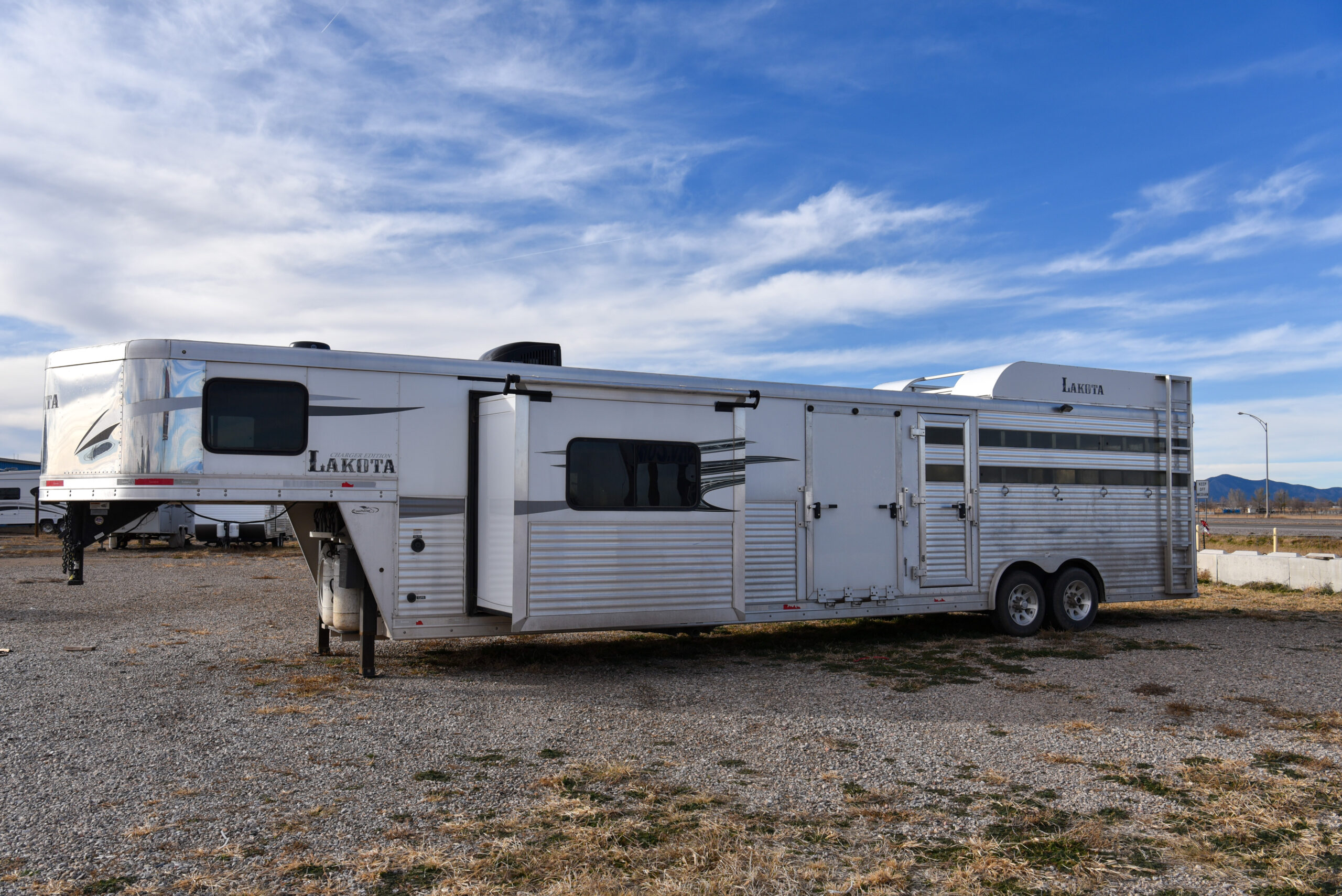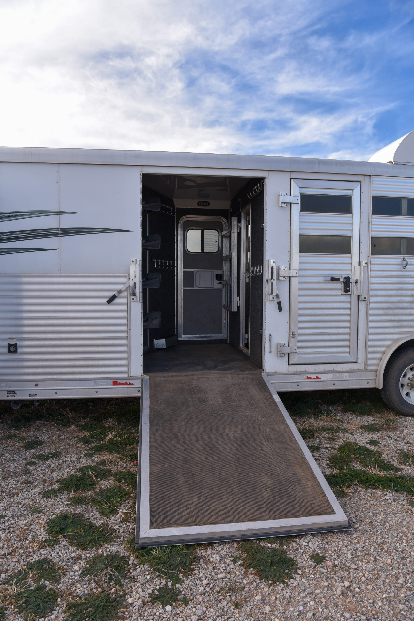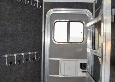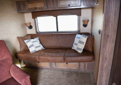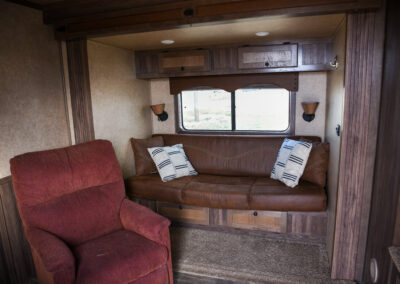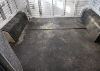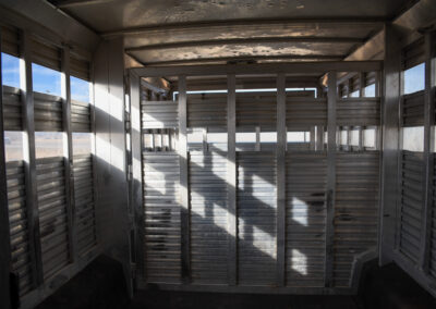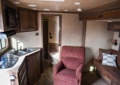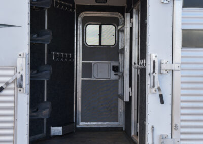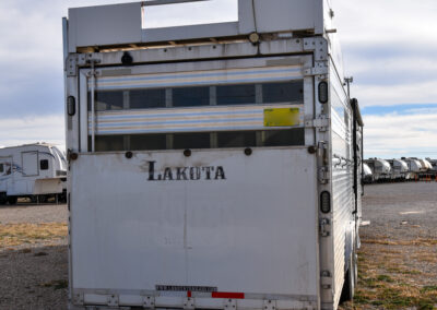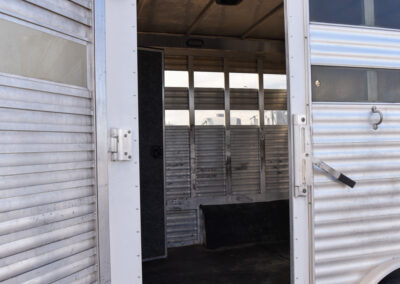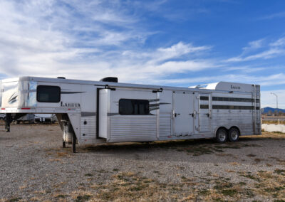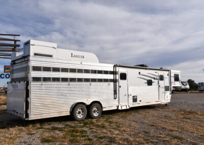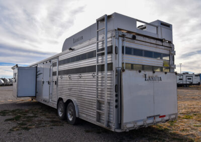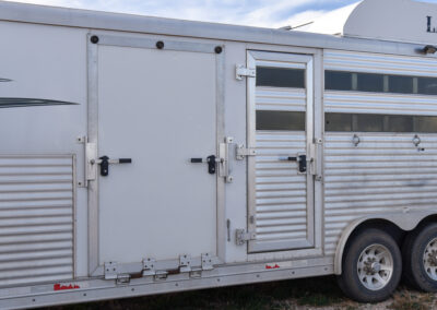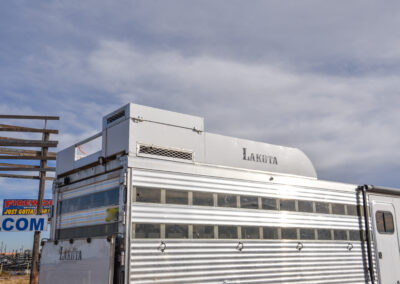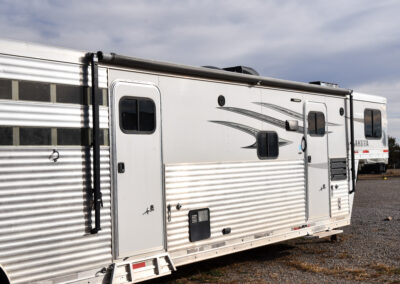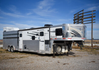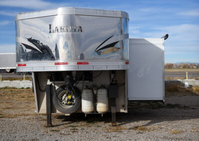 This living quarters trailer has it all! Comfortable front living quarters with 1 slide. 16′ LE GN with 11′ LQ, 8′ wide with midtack and side ramp. Kitchen has all the must-have’s including cooktop, sink and fridge. Sofa converts to sleeper. Queen bed and LCD TV. Enclosed bathroom. 3′ shortwall pie shaped midtack ramp RS access door. I beams 12″ on centers livestock area. Rear ramp over rear doors. Awning, hayrack with generator rack and 3.6 LP generator.