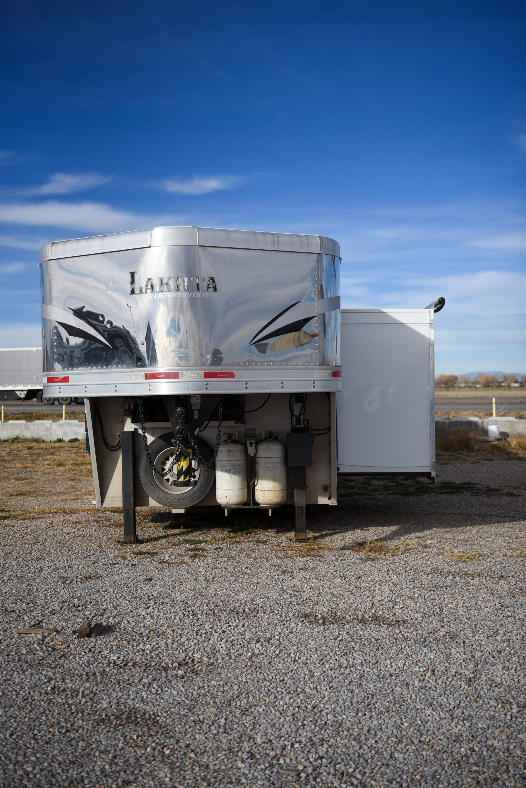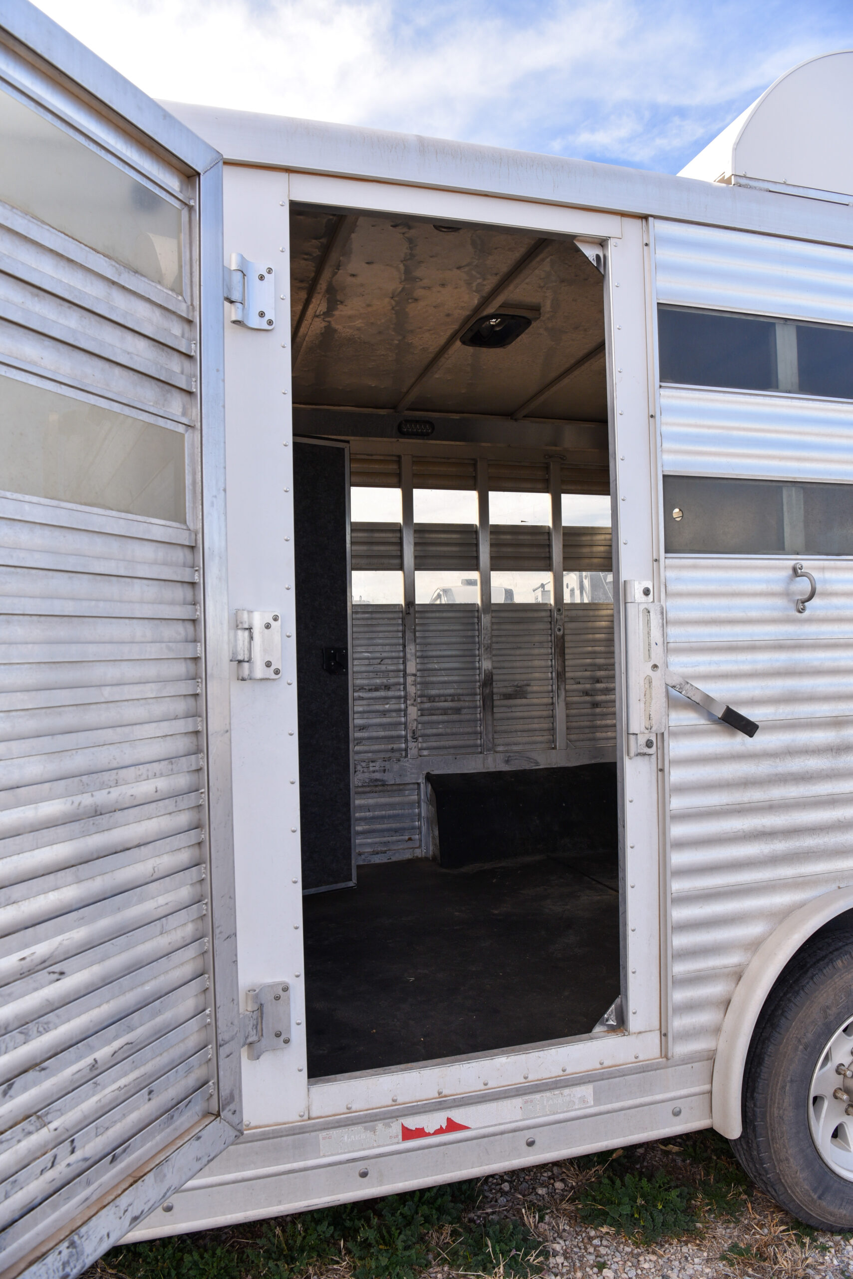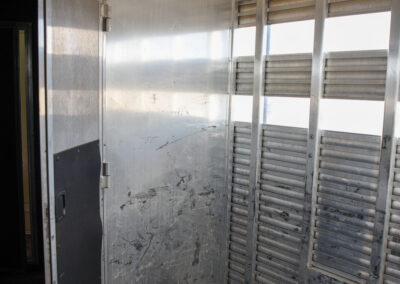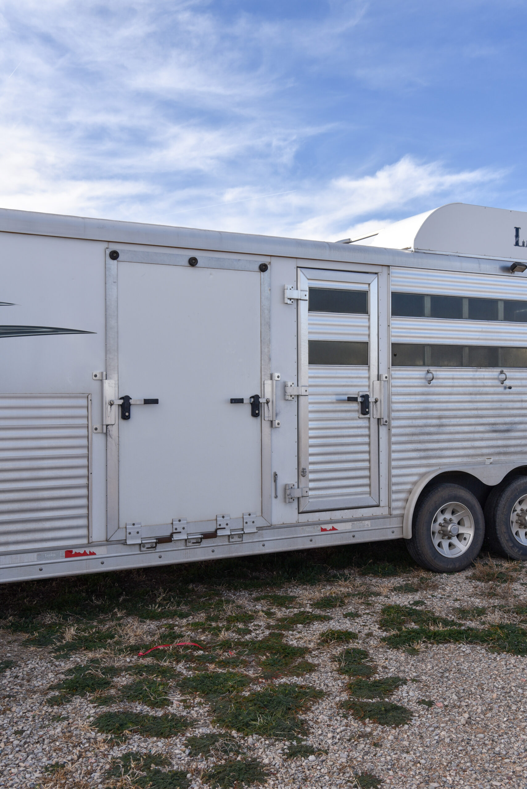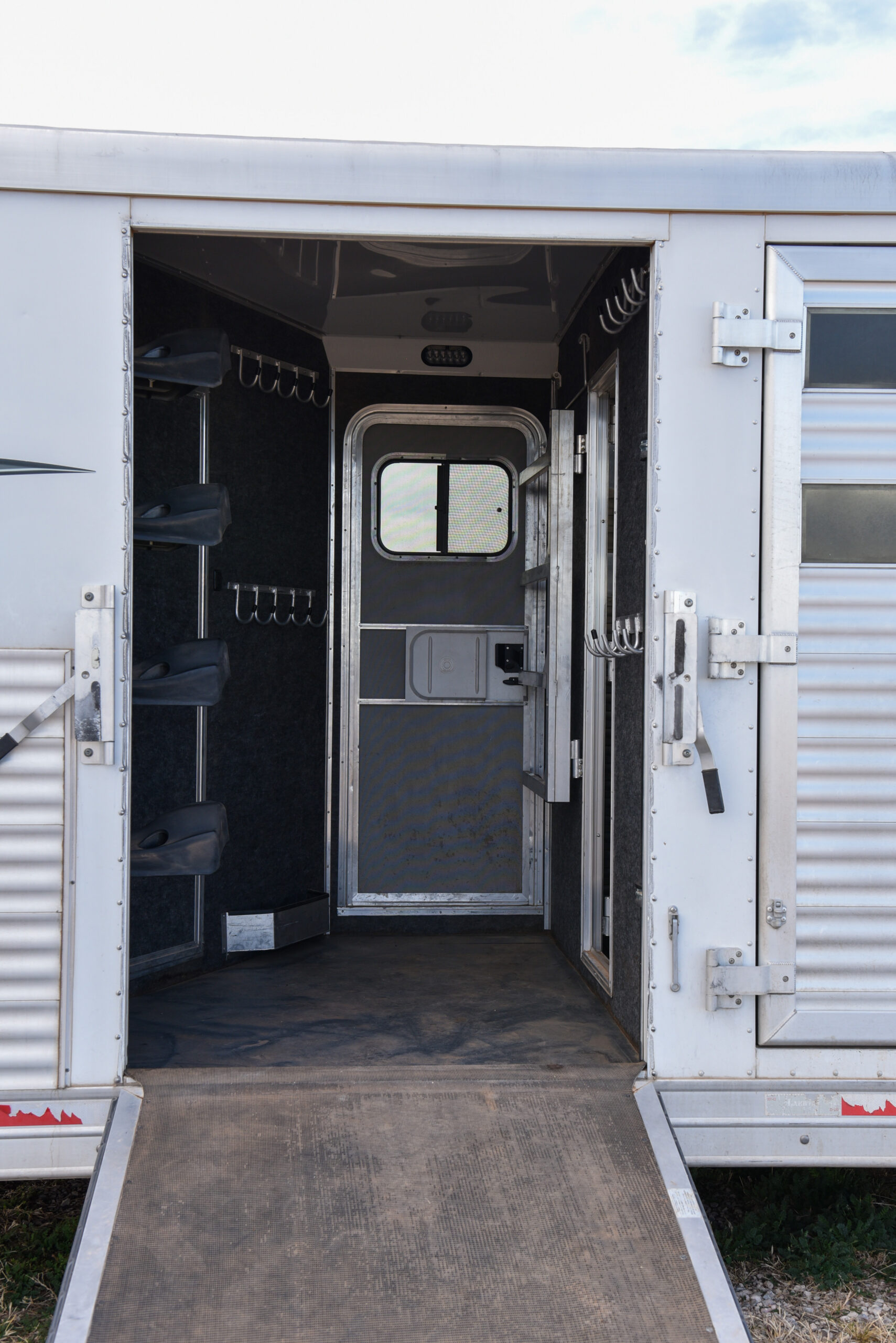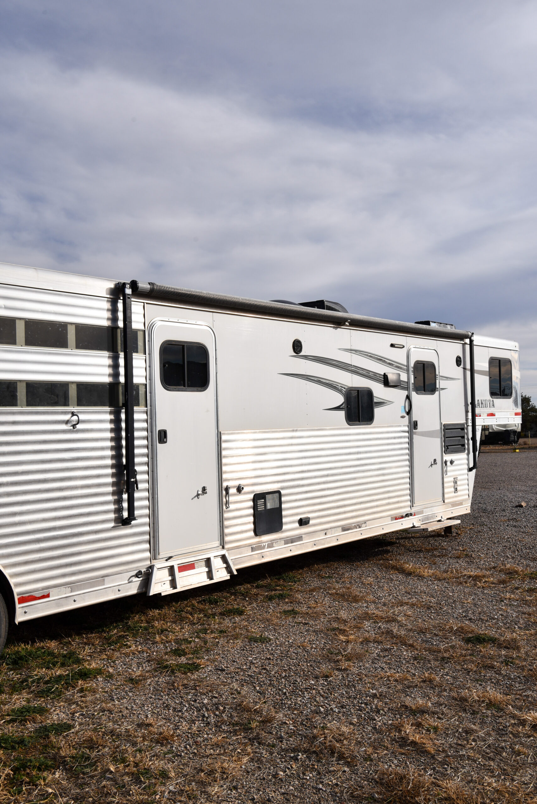 This living quarters trailer has it all! Comfortable front living quarters with 1 slide. 16′ LE GN with 11′ LQ, 8′ wide with midtack and side ramp. Kitchen has all the must-have’s including cooktop, sink and fridge. Sofa converts to sleeper. Queen bed and LCD TV. Enclosed bathroom. 3′ shortwall pie shaped midtack ramp RS access door. I beams 12″ on centers livestock area. Rear ramp over rear doors. Awning, hayrack with generator rack and 3.6 LP generator.