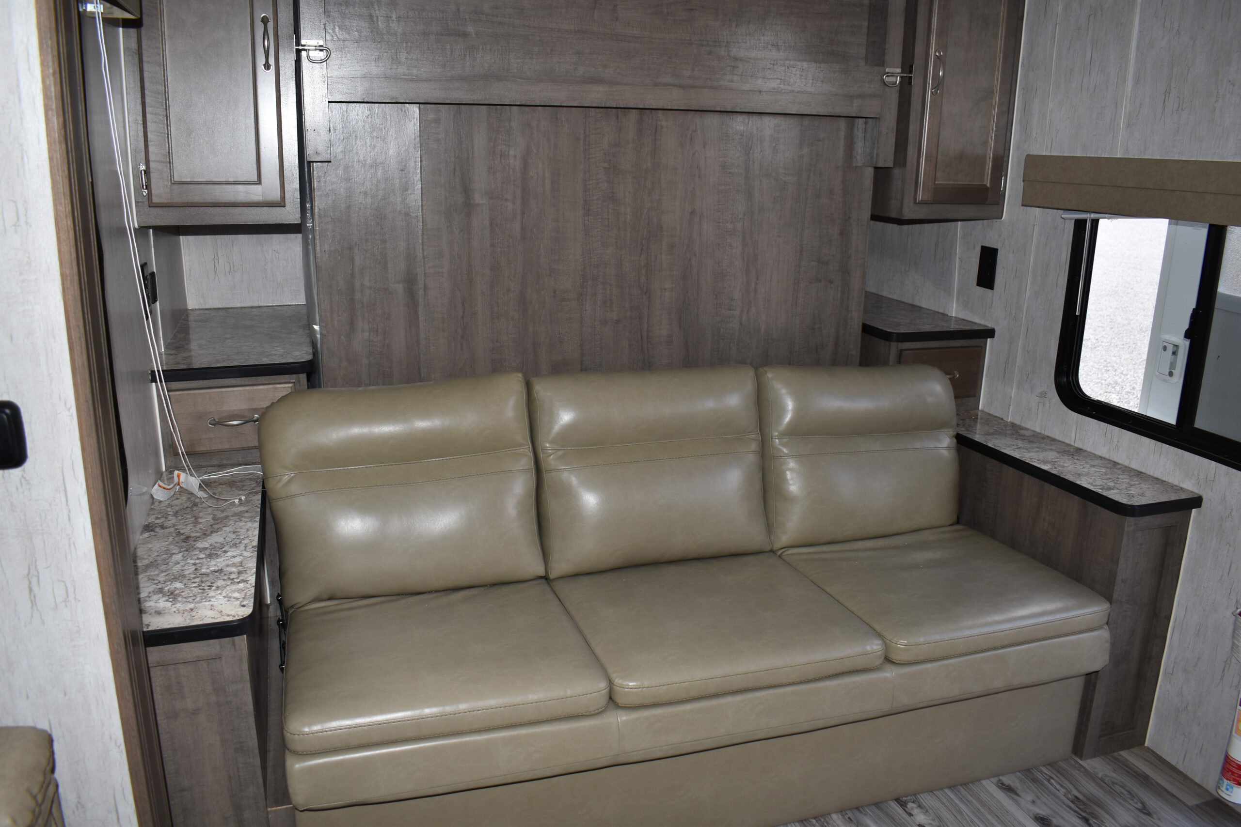 Lightweight! Save thousands on this brand new 2024 model! Compact murphy bed floorplan maximizes living space and seating during day and converts to comfortable bed at night. 1 slide. Kitchen with all the must-have’s. Sofa. Rear enclosed bathroom. Upgraded entry steps, fiberglass exterior, power front hitch and electric awning.